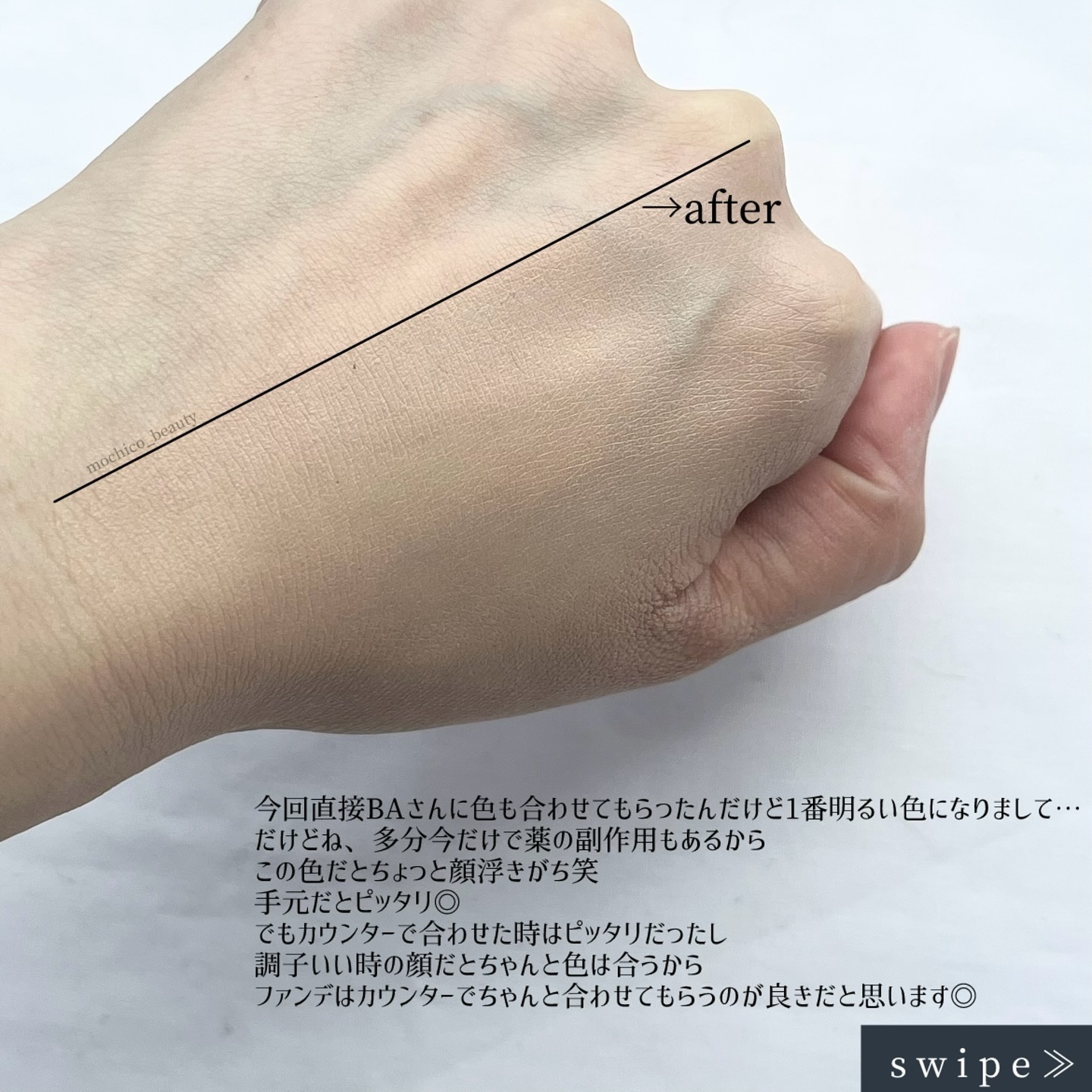 使用感はマットなのにサラサラで 伸びも良いから使いやすく カバー力が抜群に良い!!! 肌が綺麗に見えるから感動🥹流石だわぁ、、 マスク付けてても全然よれなかったし! 崩れにくいのはこの季節本当ありがたい😭