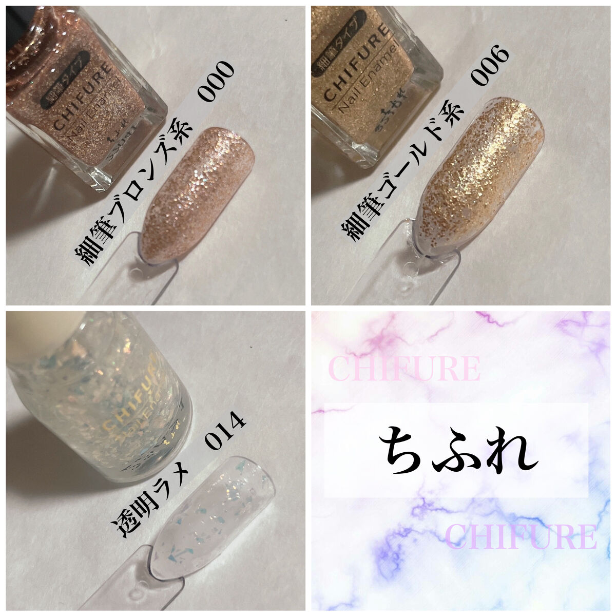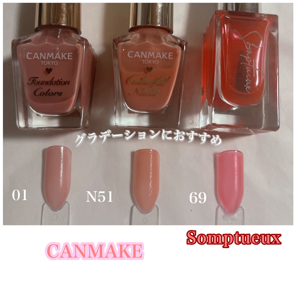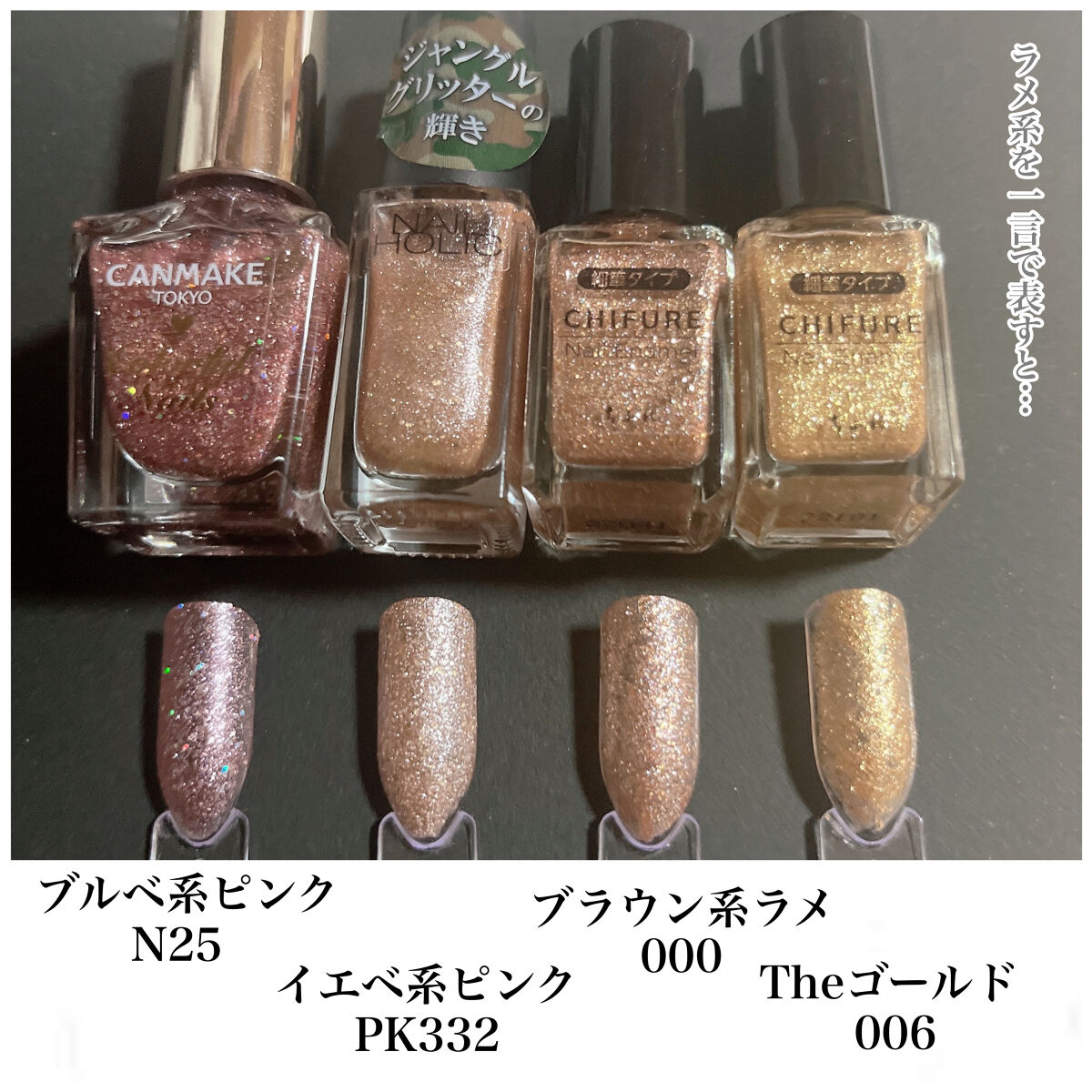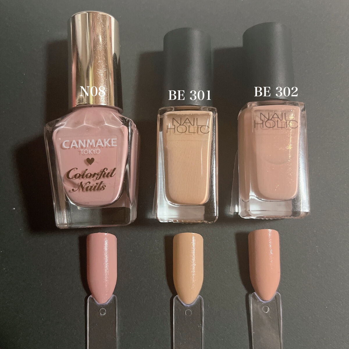 全て2度塗りです。さっそくレビューSTART〜!★キャンメイク ハケがしっかりしていて塗りやすい。 2度塗りや適当に塗ってもムラにならない 乾くのも早め。持ちが1番良い。★ネイルホリック ハケが1番小さくて伸びも良いし ムラにならないし扱いやすい 乾きは普通。★ちふれ ハケが柔らかめで平たいくコンパクト。 乾くのは少し遅め。 細筆も程よくしなりがあって描きやすい。★gene ハケの大きさもちょうど良く、発色も良い。 伸びは悪いので多めに取って急いで伸ばすこと。 お湯に弱く数日で細かいヒビたくさん入る。 乾くのが遅め。★st ハケも大きくて毛の量が多い。 思ってたより多く液が取れてしまうので 慣れるまでは大変。乾くのは遅め。最後の画像ですが似てるかな?と思ったのですが全然似てませんね。汗まあご参考までに印象としては…キャンメイクN08はパープルっぽいネイルホリックBE302はほんのりローズっぽいネイルホリックBE311はキャメルっぽいって感じですかね。色に寄って違いはあると思いますが、全て使ってみた感じの印象はこんな感じですかね。どれも値段と使用感が見合ってると思います。100均が少なめなのは欲しい色がほとんど売ってなかったから😢ダイソーさんのサンリオのポリッシュも欲しかったのですが狙ってた色が全く売ってなくて諦めました。にしてもどの色も可愛い〜本当は全色集めたい😭次回はトップコートとトップジェルをレビューします!では!この辺で少しでも参考になれば幸いです。