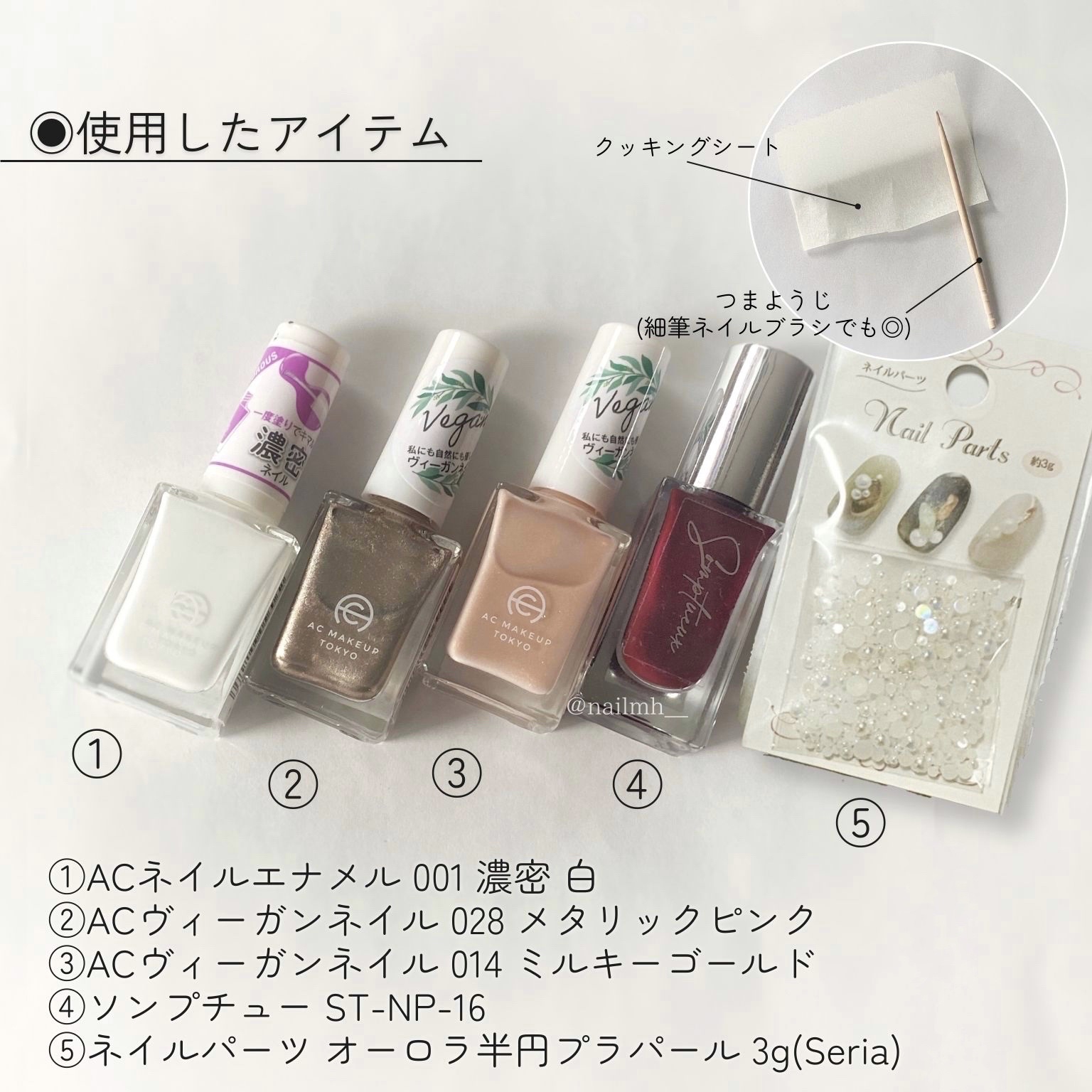 𓊆TOTAL¥550𓊇ALL100均で🌟祝賀の水引風ネイル.⋆𝜗𝜚𓈒𓈒祝賀ムードにぴったりな華やかな和柄ネイルをご紹介します!👘🎍 紅白に金で縁起のいい色合いに縁起の良いモチーフを詰め込みました🪄︎︎ しかもALL100均、トータル550円でできちゃいます◎ 塗り方も紹介しているのでよければ是非試してみてください👌🏻̖́- ──────────────────────── 【使用したネイルポリッシュなど💅🏻】※画像4枚目参照 ①ACネイルエナメル001濃密白|¥110(税込) ②ACヴィーガンネイル028メタリックピンク|¥110(税込) ③ACヴィーガンネイル014ミルキーゴールド|¥110(税込) ④ソンプチューST-NP-16|¥110(税込) ⑤ネイルパーツオーロラ半円プラパール3g(Seria)|¥110(税込) ●市販のクッキングシート ●爪楊枝(ネイル用細筆でも◎) 𓂃𓂃𓂃𓂃𓂃𓂃𓂃𓂃𓂃𓂃𓂃𓂃𓂃𓂃𓂃 親指の塗り方は画像3枚目にてイラストで詳しく解説してます!🔍 それぞれの指ごとの塗り方については画像2枚目を参考にしてください💁♀️ 上手に仕上げるためのコツは下で詳しく説明しているので、 併せて読んでいただけると嬉しいです😌🤍 𓈒 𓈒 【祝賀の水引ネイルを綺麗に仕上げるポイント】 ◉クッキングシートにベースコートを塗る時はなるべく広めに塗っておくこと。 →ベースコートを塗ることで乾いた時にペリっと剥がしやすい状態をつくるんですが、 この時ベースコートを塗る範囲が狭いと、剥がす時に柄を破いて傷つけてしまったり 柄を描いた時にベースの範囲をはみ出てしまい、上手く剥がせず柄が切れてしまうなどの失敗の原因になりかねないです😣 爪の幅よりベースコート部分が広かったとしても シートから剥がした後にハサミなどで爪に合わせてサイズを調整したり融通が効くので、広めに塗っておく方がおすすめです! ◉クッキングシートに柄を描く時は、必ず事前に親指の爪の縦横幅を確認し、おおまかに爪のサイズに合わせた大きさで描く事。 →シートに柄を描く時、特に水引のリボン部分が爪の横幅をはみ出るサイズになってしまうといざ貼ろうとした際に柄が見切れてしまいます🥲 そのため、リボン部分の大きさは自爪の横幅より小さめに描いてください! 縦幅もなるべくぴったりサイズに描くことをおすすめしますが、 貼った時に長さが足りなかった場合は足りない部分を描き足せばOKなので、少し短めでも大丈夫です!👌🏻̖́- ※ベースに関しては爪のサイズよりも広めに塗ってください ◉シートから剥がしたネイルシールを貼る時は、皺がよったりしないようゆっくり丁寧に貼ること。 →この作業がかなり仕上がりに影響してきます! 貼り付ける時にシワがよると柄もヨレ凹凸もできて不恰好になってしまいます😭 また、貼り付ける手順は ❶トップ(ベース)を塗る→❷乾かないうちにネイルシールを貼る→❸乾いたらもう一度上から仕上げのトップを重ねる なんですが、この時❶の手順を省いて❸の仕上げのトップで貼り付けようとすると失敗する可能性が高いです!⚠️ 少し面倒にはなりますか、必ず❶→❷→❸の手順を踏んでください🙌🏻 𓈒 𓈒 「他のネイルで代用するには?🤔」「ここが分からないから詳しく教えてほしい!」などの質問や感想、リクエストなど どんな事でもコメントいただけると嬉しいです☺️💬 いつもいいね・保存などありがとうございます! 最後まで見てくださり有難うございました❕🙌🏻 ──────────────────────── その他のネイルデザインは【#uiKaネイル】から💫 \𝙏𝙞𝙠𝙏𝙤𝙠はじめました.ᐟ.ᐟ/ TikTokも@nailmh__でやってます❤️🔥 Instagram/Twitter/LIPS→【@nailmh__】 𓈒 𓈒#ネイル#セルフネイル#ポリッシュネイル#和ネイル#レッドネイル#水引ネイル#正月ネイル#ニュアンスネイル#プチプラネイル#冬ネイル#ACネイル#100均ネイル#煌めく冬ネイル