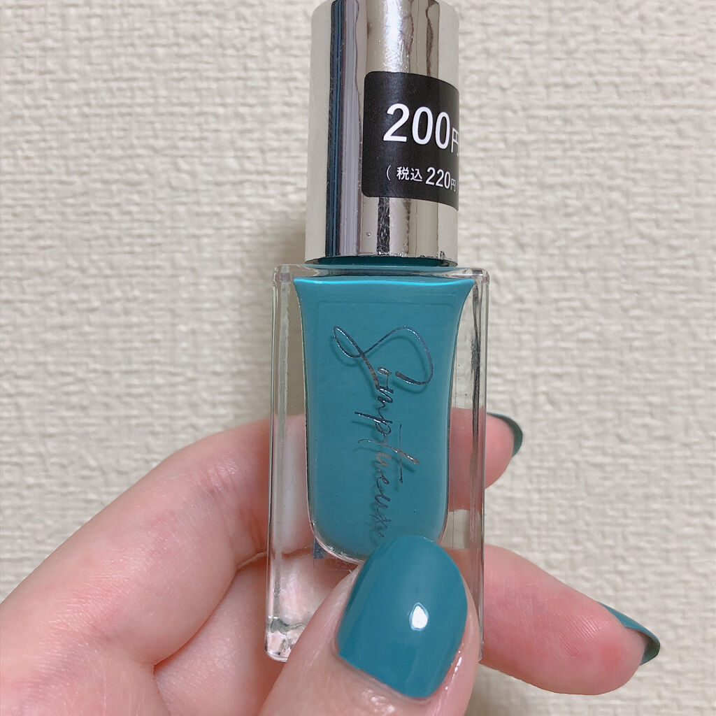DAISOSomptueuxソンプチューネイルポリッシュST-NP-45濃いめの青緑のようなカラーで可愛い🥰🥰一度塗りでもしっかり発色してくれました!!パキッとしたカラーなので1度塗りだけでも全然大丈夫そう角が丸くなった平筆なのでかなり塗りやすかったのも使いやすいポイントです👏👏✨トップコートなどもしっかりつければ持ちも🙆♀️お手頃価格でこの発色と塗りやすさはありがたいです🙏✨#DAISO#daiso_ネイル#ネイルポリッシュ#ダイソー_ネイル#ネイル#newネイル#セルフネイル#セルフネイル_夏