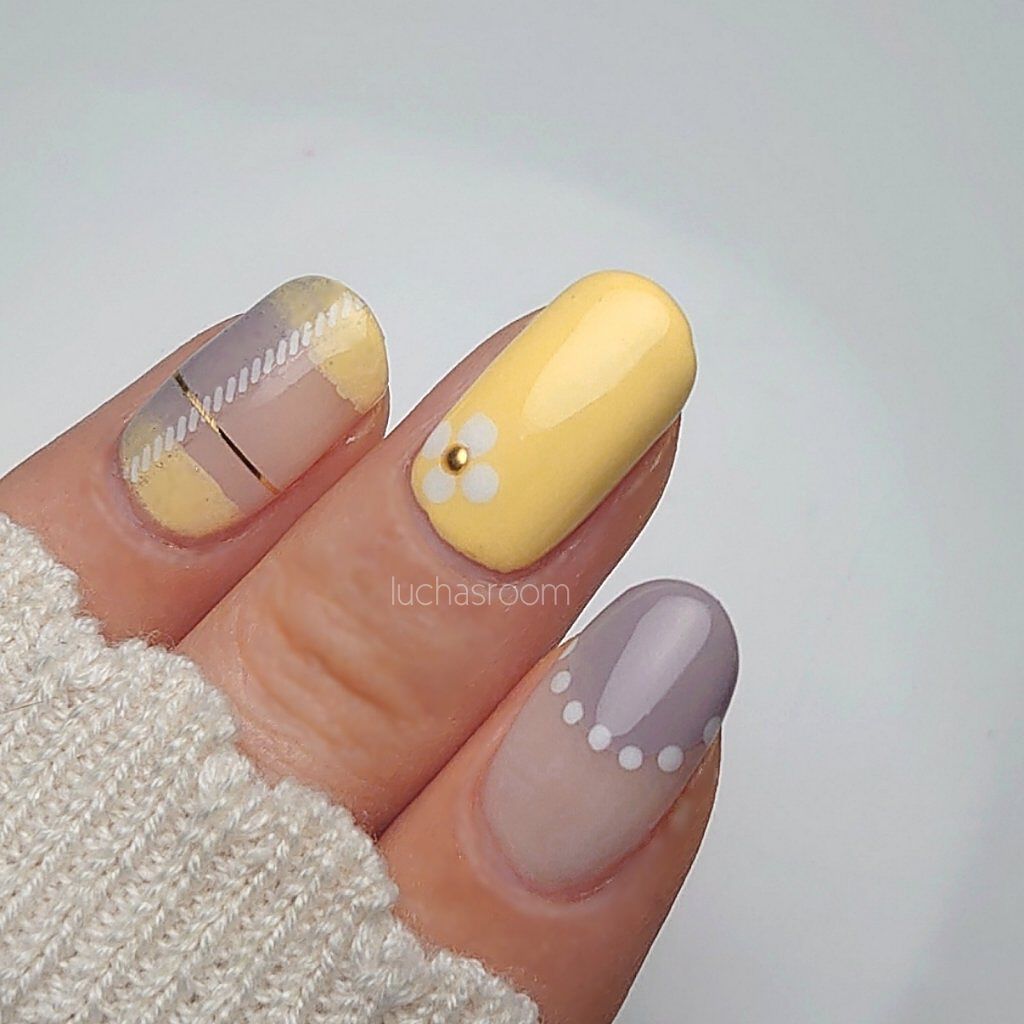 クリームイエロー×ライトグレー今年のトレンドカラー、クリームイエローはライトグレーと相性抜群✨春待ちネイルにもぴったりのカラーリング♡メインの2色はどちらもソンプチューです!人差し指の爪先部分も、ソンプチューならラウンド平筆だから簡単✨薬指にはドットペンで描いたお花をワンポイントに❁ベースは乳白色を使うことで軽やかに♪今回はムラになりにくく、根元までキレイに仕上がるラウンド平筆のディーアップファンデーションピュアミルクを使いました。この春夏のトレンドカラーまとめ、乳白色ネイルまとめも投稿していますので、参考にしていただけたらうれしいです♡使用色ソンプチュー1、52ディーアップファンデーションピュアミルク※GENEネイルホワイト※のみ提供品、あとは購入品です。#春ネイル#春ネイルデザイン#春ネイル2022#春待ちネイル#チェックネイル#小花ネイル#お花ネイル#イエローネイル#イエローネイルデザイン#グレーネイル#グレーネイルデザイン#セルフネイル#マニキュア#ネイルポリッシュ#ポリッシュネイル#マニキュアネイル#マニキュアデザイン