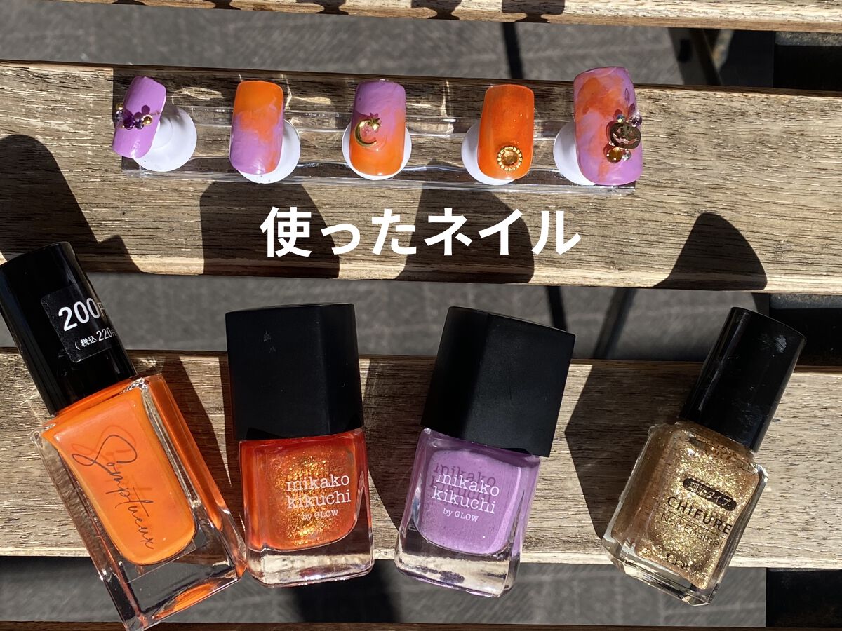 ハッシュタグ↓↓↓#ハロウィンparty2022 🎃私のハロウィンネイル🎃第1弾⭐️ 使ったネイルは、①DAISOSomptueuxソンプチューネイルポリッシュST-NPN-02②GLOW 2020年6月号増刊ネイル2色③ちふれネイル エナメル 細筆タイプゴールド系ラメ細筆