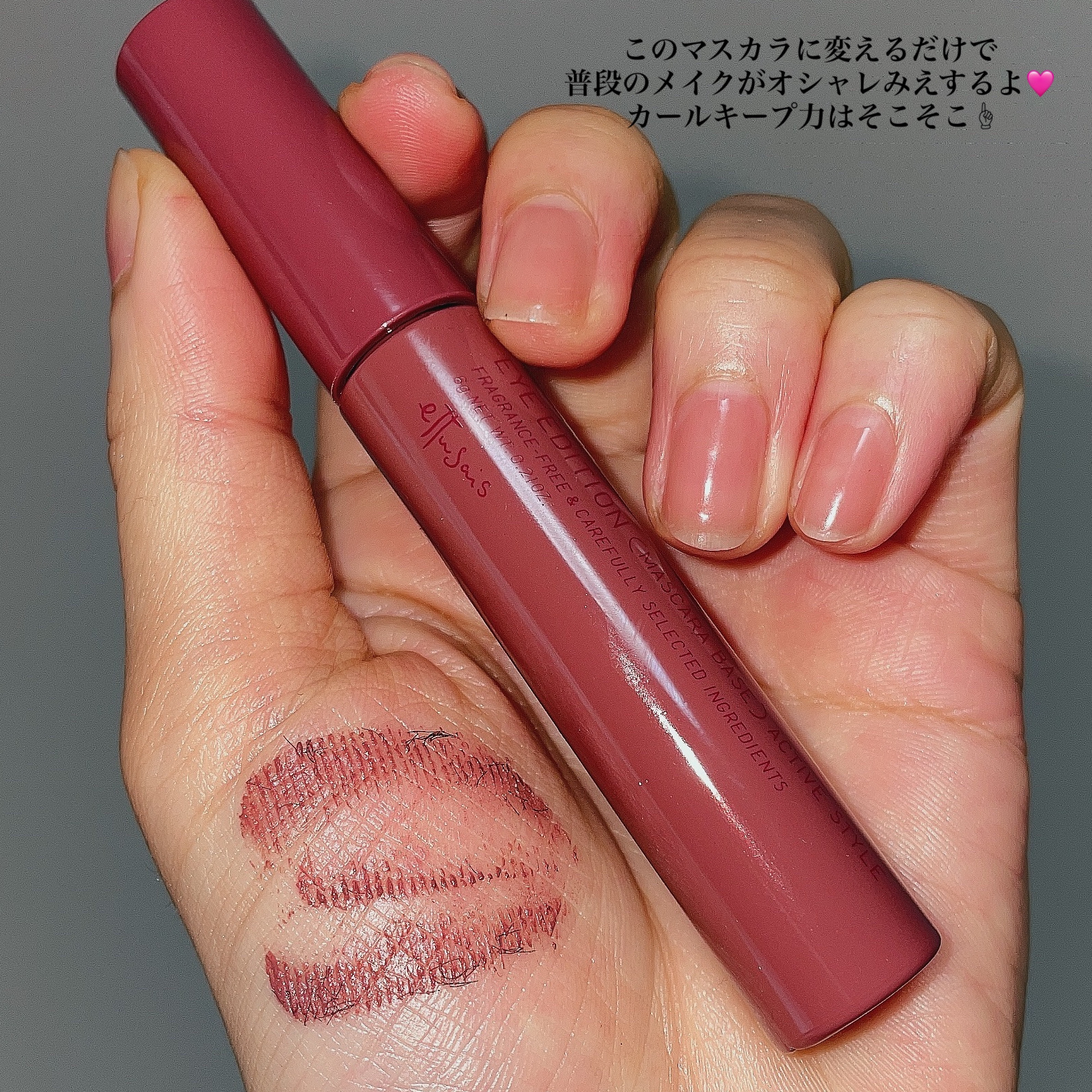 バーガンディピンクで カラーメイクができる😍 繊維入りで まつげに少しボリュームを出してくれる🧡 カールキープしてくれるから マスカラ下地にもこれひとつでも メイクできるよ🧡