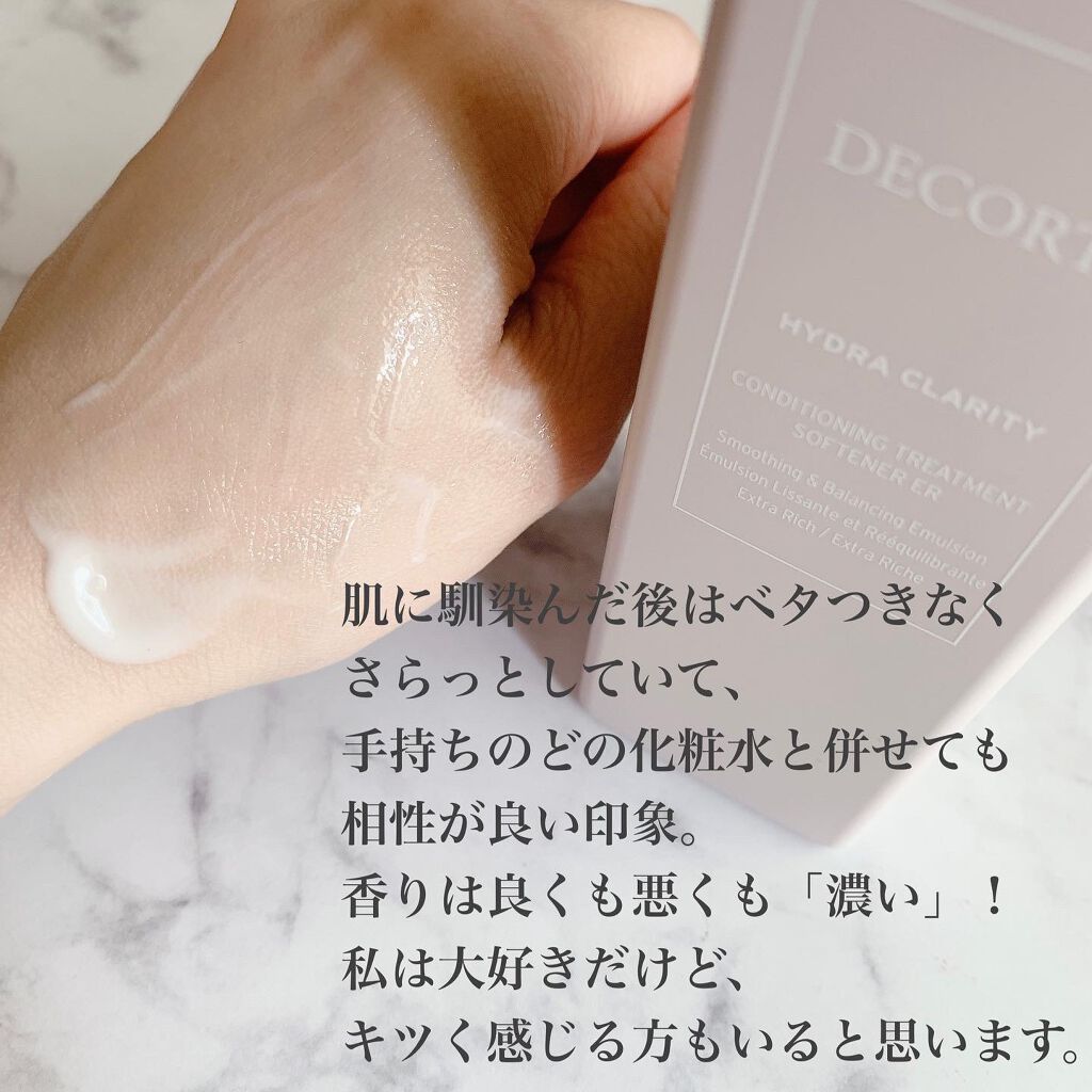 お気に入りの乳液🙌🏻💕DECORTÉのイドラクラリティシリーズ、コンディショニングトリートメントソフナーERをレビューです(๑•̀ㅁ•́ฅ✨良すぎてリピートしました♡一度先行乳液を体験するとやめられなくなる🥺!今の乾燥する時期にもおすすめです🙆♀️✨イドラクラリティシリーズはみずみずしく、透き通る美肌糖の透明感。毛穴目立ち・乾燥・くすみ・肌あれもケア✨という人気のシリーズです🌼*・薄いピンクのパッケージがかわいいですよね♡こちらは先行乳液のタイプで、化粧水の前に使用する乳液です!先行乳液のメリットについてはこちら✨化粧水の前に使うことでスキンケアの土台として、角層からふっくらとやわらかな肌に導きます。肌をふっくらとやわらかくし、油水分のバランスを整えるだけでなく、角層のすみずみにうるおいの通り道を整えるためです。(公式サイトより)あらためて理解しながら使うとなるほど!と実感しながら使うことができました(*•̀ᴗ•́*)و̑̑肌が柔らかくなる感覚がとっても大好きなので、これはとても納得!!コットンで優しくなじませて使うのですが、その時間が幸せです😍💓香りもよく癒されます🌼*・保湿力もしっかり感じていて、これからの季節もとってもお世話になります!!#DECORTÉ#イドラクラリティ#コンディショニングトリートメントソフナーER
