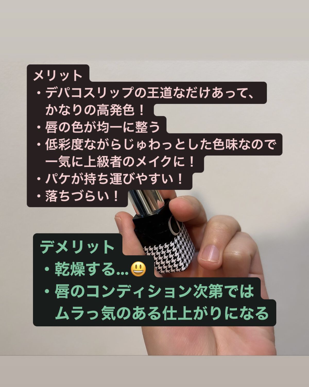 Diorルージュディオール100Vヌードルックベルベットニュールックエディションこの千鳥格子柄、無事に買えました。すごくかわいい!パケだけではなく本体にも千鳥格子柄でエンボスが入っていて見ているだけで本当にテンションが上がってしまいます。布じゃないから…という声も見かけましたが私は個人的には布地が汚れてしまうほうが悲しいので、このプリントされた状態で逆に良かったなと思いました。100Vは本当にマット。パケの色番が明記されているふたの部分もマットで可愛いのです。マットリップは乾いて苦手だったのですが、これはしっとりとした塗り心地。するする優しい肌当たりなので優しく塗っても色が出やすいです。さすがDiorという感じ。Diorのリップはもとから相性が良くて皮剥けしないのでそのおかげかもしれません。色味はしっかりベージュですが、白っぽいベージュではなくピンクみのあるベージュカラーなので、主張が強すぎず使いやすい色味です。ぼかした時の色味もふわっとして可愛いなという印象です。最後までご覧頂きありがとうございました✨良かったら🤍/+👤よろしくお願いします🍓✩°。⋆♡*°見返したくなった時のために🖇もおすすめです💭リクエストがあればコメント頂けると嬉しいです🕊💕#推しマットアイテム#dior#ルージュディオール#100V#ヌードルックベルベット#ニュールックエディション