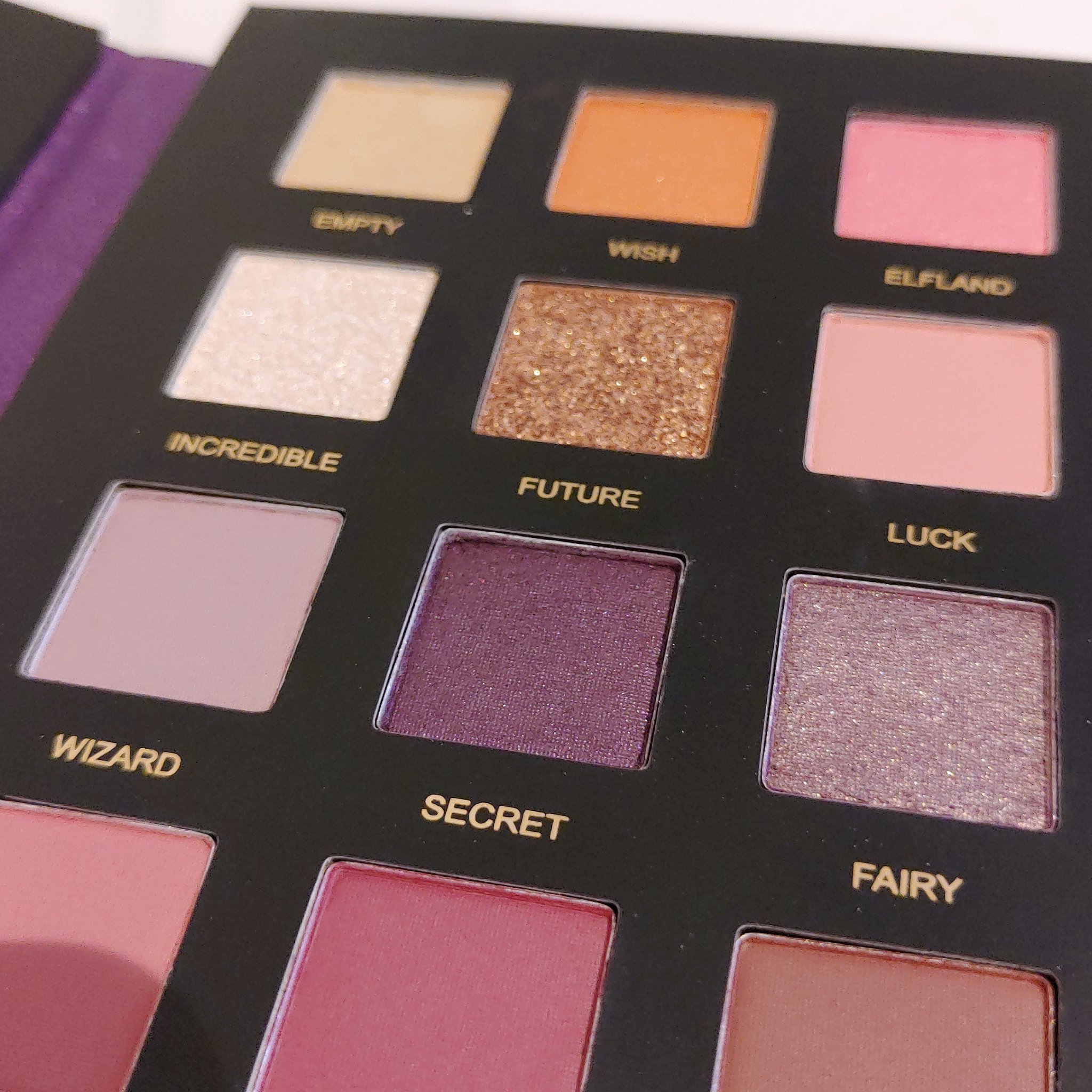 魔法書のような見た目が可愛い アイシャドウパレットです🔯🧙 思ったより大きめなパケのアイシャドウで、左側のミラーも大きめでした。 マット、パール、グリッターの質感の違うアイシャドウがセットになっているのでメイクの幅が広がる所も良かったです🎵