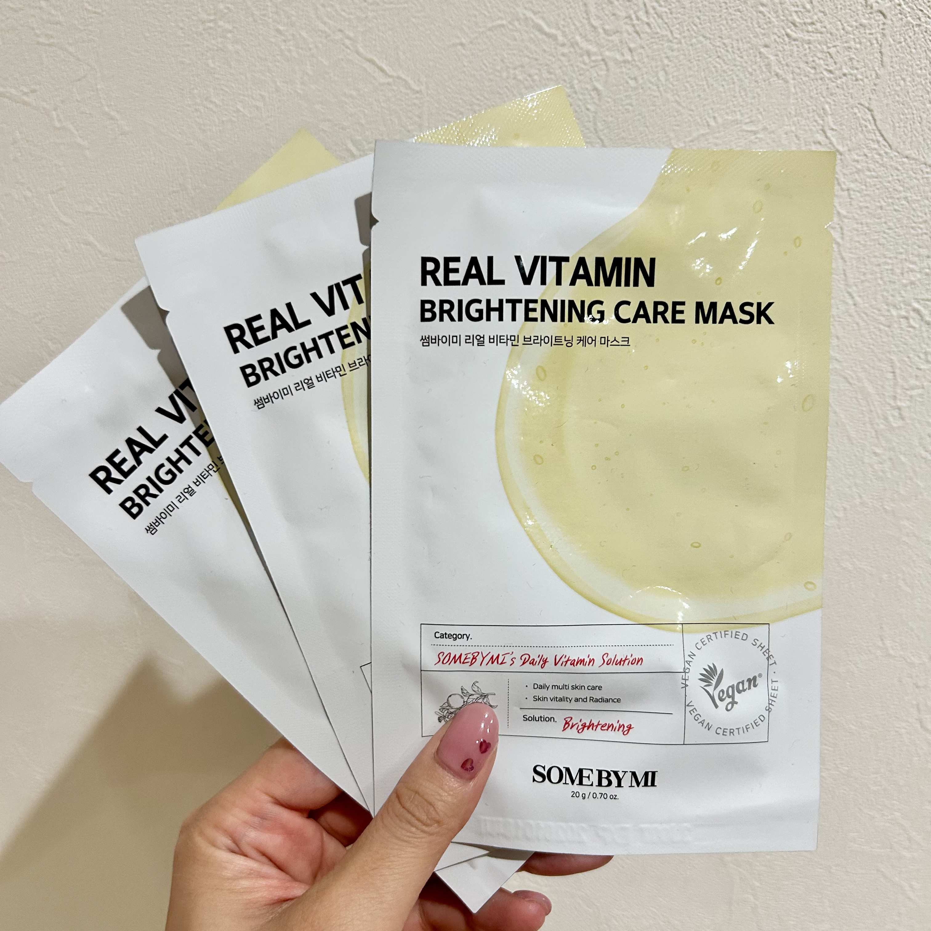 SOMEBYMI//✔︎リアルビタミンブライトニングケアマスク→疲れたお肌、欠点が悩みの肌、くすんだ肌✔︎一枚にぎっしり詰めたリアルエッセンス✔︎浮き上がることなく軽くリアル密着袋を開けてみると、少し柑橘系の香りがしました✨密着も良くて、ベタベタせず、さっぱりでした✨10〜20分の記載があったので、私は15分ぐらい付けてました👍シートを取ってみてると、ワントーン上がったように思えました♫夜も良さそうですが、時間あった時に朝にもピッタリかなっと💕#サムバイミー#シートマスク#リアルビタミン#ビタミンc#ブライトニングケア#スキンケア