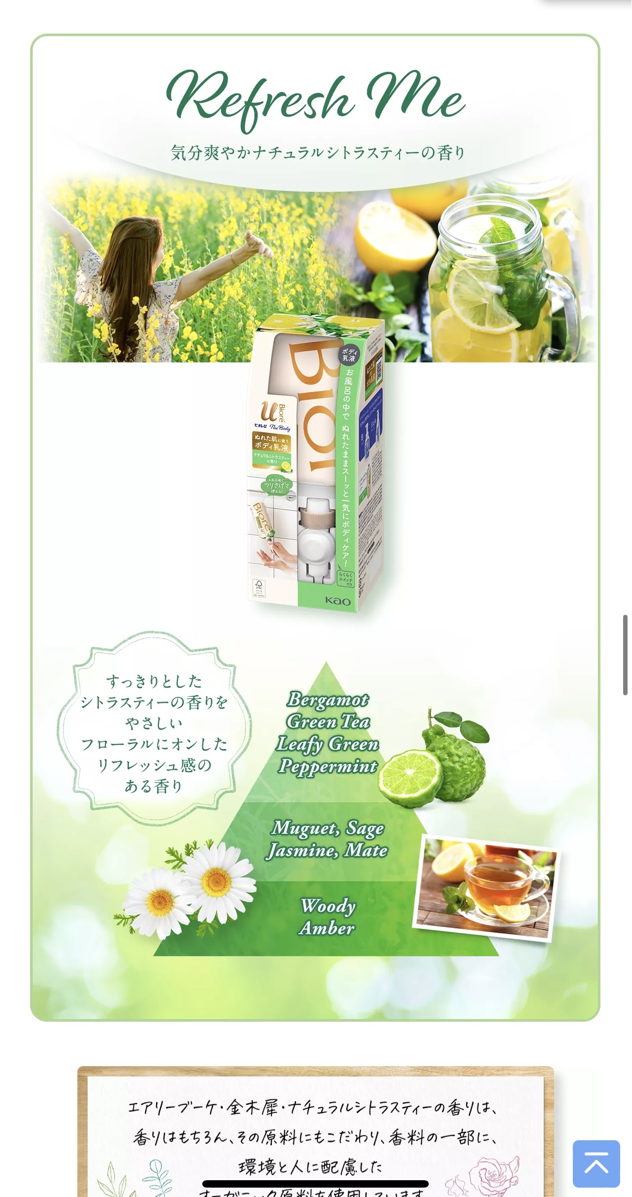 お風呂上がりに濡れた肌にそのまま使います。体についた水分と程よく混ざって伸びがいいです。軽くバスタオルで水気をとったら、しっとり肌に! 普通のボディクリームに比べて手間が少ないので、毎日続けやすい♪ そのおかげか乾燥もしにくくなりました✨ ワンプッシュで出せて時短になるし、お風呂上がりにすぐ使えるので、塗り忘れも無い。 ほどよいしっとり感でベタベタしないので、服がすぐ着れる。特に寒い日はありがたい! エアリーブーケ→私はこっちの方が好きでした! 甘めでフローラルよりはフルーツっぽい感じ。 ナチュラルシトラスティー→さっぱりめの香り。 シトラスがメインで、ティーの部分はよくわからなかったです。