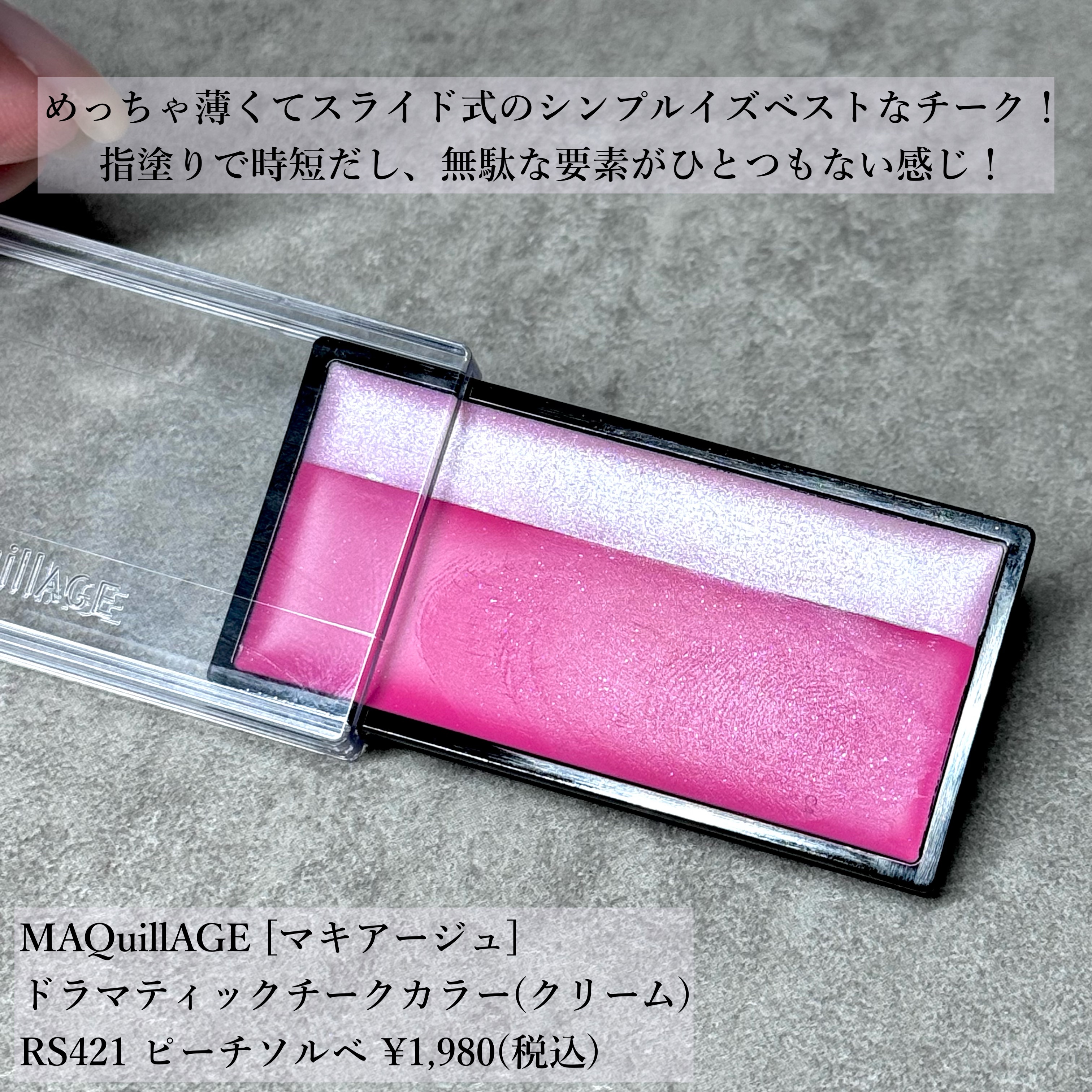 マキアージュ❤️ドラマティックチークカラーRS421ピーチソルベクリームタイプです。ハイライト入りなので便利!指塗りで適当でも、ちゃんと可愛くなる!透明感あるジュワッとした感じに仕上がりますよ〜薄型で持ち運びにもいい。#雪のような透明肌レシピ...
