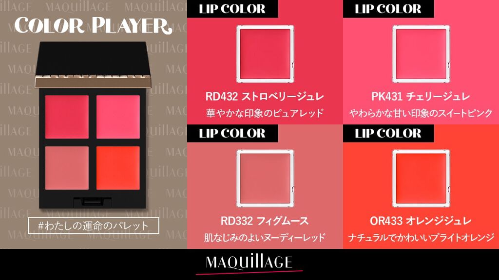 好きなカラーを自由にカスタマイズ。 自分だけの運命のパレットが完成! PK142バニラシュガー 透明感のある輝きラメカラー 華やかに輝くピンクゴールド。 PK214フレーズオレ(パール) ふんわりキュートなクリアピンク RD532カシスボンボン 運命のブラウンカラー。 PK431チェリージュレ やわらかな甘い印象のスイートピンク。 透明感とうるおい続く透け感グロスのリップカラー。