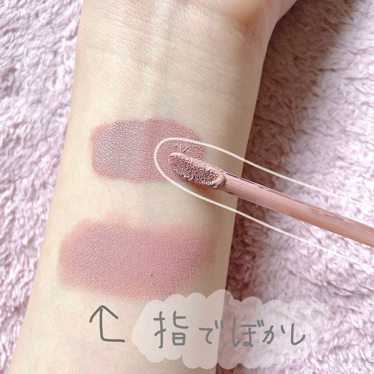 マットに仕上がるリキッドアイシャドウ 青みピンクをくすませたくすみピンクなので青みが得意な人向けではあるけど、くすみカラーなので割と使いやすく感じる テクスチャは軽く伸びが良いうえにしっかり発色 伸ばしている時はみずみずしいのに伸ばして乾いたらサラサラマットになり密着 乾いてしまえばヨレにくく崩れにくい 1日過ごしても二重幅に溜まることもなかった 量が少なすぎるとムラになりやすいので注意 もけもけチップで本体が細長くかなりスリム ポイント使いよりもこれを瞼全体に伸ばしてからグリッターやラメを部分的に乗せるのが良かった マットでくすみカラーなので流行りを押さえたイマドキメイクに 500円でこの絶妙なカラーが買えるのはかなりすごい