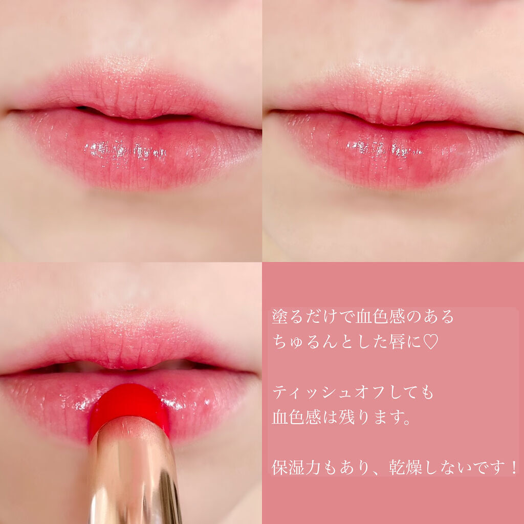 ガラス玉みたいな透明感うるうるリップ ほのかに発色して潤い感も自然なので学校リップにピッタリだな〜って思いました!! 唇の縦じわや荒れが目立たなくなるほどの潤いで、モテリップ間違いなし!! 肌を明るく見せ、爽やかさを与えてくれるコーラルカラーリップ オレンジ色が可愛いくてイエベの学生さんには超おすすめ!! 肌なじみの良い花びらみたいなローズカラーリップ 発色が少し濃いめだから放課後リップにも!!ブルベの学生さんに超おすすめ⸜❤︎⸝ 発色が控えめだけど、ティッシュで拭き取っても色が残ってるから何回も塗り直さなくても大丈夫🤍そしてとにかく潤いが凄い!!敏感唇の私でも荒れずに使えた♡♡ すっぴん顔にも浮かないレベルの自然リップだからお泊まりや、ナチュラルメイクにも使えるよ👍🏻