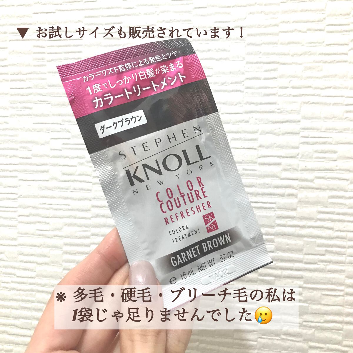 【検証!ブリーチ毛はカラトリでどれくらい染まるのか!?】●スティーブンノルニューヨークカラークチュールカラートリートメント(002ダークブラウン)●価格:本体1,980円(スギ薬局)/お試しサイズ154円(ウェルシア)全頭ブリーチを通算2回した私は、少しでも髪を労るべく美容室でブリーチリタッチをするのは2ヶ月に1回と心に決めていましたが、、、仕事の都合で一時的に髪色を暗くする必要があり、市販のカラートリートメント(以下、カラトリ)で口コミがよかった、スティーブンノルニューヨークのカラトリを使ってみました✨比較画像もあるので、ぜひ参考にしてみてください!🙆🏼(使用感)さすがスティーブンノルのシリーズ!カラーで傷んだ髪を補修し、自然に馴染むカラー設計。002ダークブラウンは、パッケージに「GARNETBROWN(ガーネットブラウン)」と記載があるように、ワインカラーベースのブラウンでした🍷✨カラーが落ちると黄ばみやすい人はトリートメントをこちらで置き換えてもいいのでは?と思うくらい、汚く退色するのを防いでくれます🥺このカラトリを使っていた時は髪の指通りがよくなっていました!今後ブリーチ毛でハイトーンカラーをする必要がなければ、これで染め続けたいくらいよかった、、、👏🏻(使い方)口コミで「乾いた髪に使ったほうが染まる」とのコメントが多数あったため、ビニール手袋をして、捨ててもいいブラシでムラにならないようにならしながら塗布🧤※乾いた髪に塗る際は、ビニール手袋必須です!爪の際にカラーが入って2日ほど取れない可能性アリ。↓20〜30分放置したら、茶色いの泡が出てこなくなるまでしっかりシャンプーで洗い流します。↓いつも通りにトリートメントを塗布し洗い流す。(推せる点)・お試しサイズのパウチが販売されているので、用途に合わせて本体を買うか選んだり試したりできる◎・スティーブンノルシリーズ特有のグリーンフローラルムスクの香り🌿→めっちゃ癒される香りです🥹・チューブタイプのカラトリなので使いやすい!(気になる点)・やはり髪の内側はムラになりやすくなる、、、→合わせ鏡で塗れてないところがないか確認しながら染めても大変でした💦・次回美容室に行く日にちから2週間ほど逆算して塗る必要がある。→カラトリをしていると、髪にカラーの履歴が残ってしまい、せっかく美容室に行ってもカラーリングをしてもらう際にムラになる可能性があります😭その履歴のおかげで、良くも悪くも「バレイヤージュ(ハイライトのグラデーションのカラー手法)」のようなカラーになります、、、🧹以上の点を踏まえて、★4つとさせていただきます。#カラートリートメント#ブリーチ#正直レポ
