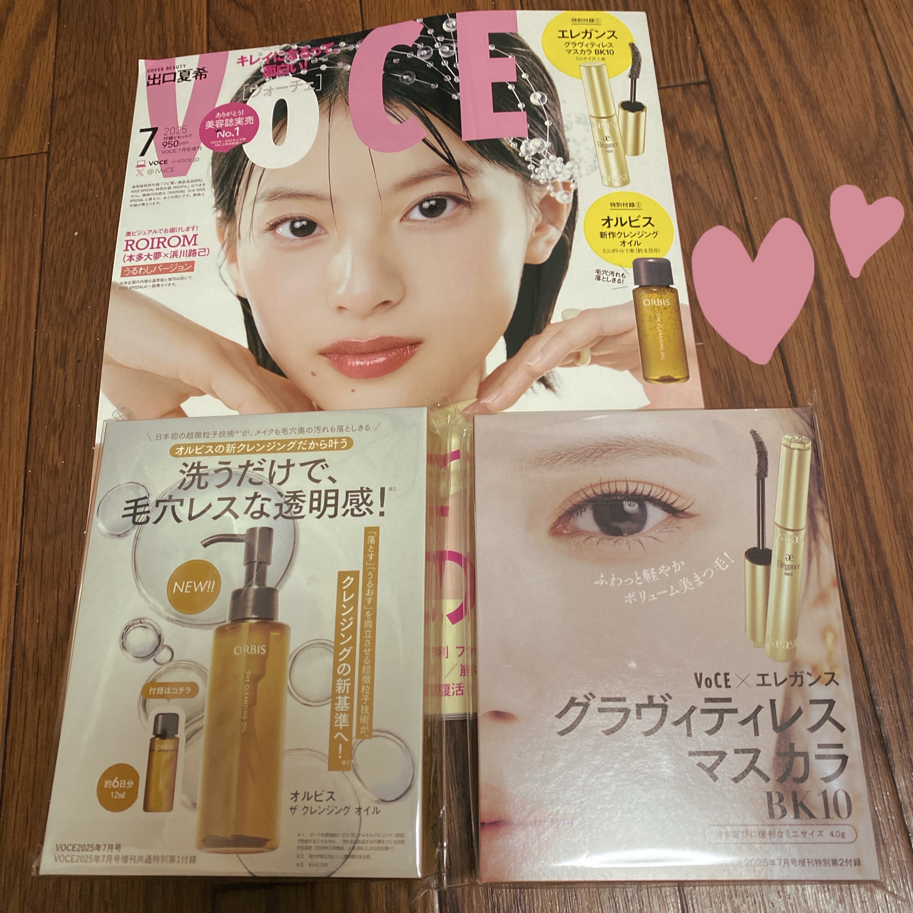 おはようございます。今日はVoCE2025年7月号増刊のご紹介です。✼••┈┈••✼••┈┈••✼••┈┈••✼••┈┈••✼[表紙]出口夏希[増刊付録]①エレガンスグラヴィティレスマスカラBK10ミニサイズ(4.0g)②オルビスザクレンジングオイル1本(12ml・約6日分)[貼り込み付録]コスメデコルテAQ毛穴美容液オイル1包※本多大夢さん、浜川路己さん出演の「SUPERPEOPLE」企画は、通常版・増刊とスペシャル版で内容が異なります。[内容]進化を極めるベースメイク、夏肌の正解を大研究!すべて隠してつけたてのまま長井かおり先生の「夏ファンデのベストチョイス」大会議櫻坂46田村保乃がたどり着いた、「どんなときもベースメイクを守り抜く方法」浜辺美波×HM林由香里ぷっくりツヤツヤ可愛さ全開真夏のjuicyタンフルリップVOCE初登場!美ビジュアルでお届けしますROIROM本多大夢×浜川路己全身うるすべバブみBODY大作戦✼••┈┈••✼••┈┈••✼••┈┈••✼••┈┈••✼今月の美容雑誌3冊目VoCE2025年7月号増刊Eléganceのグラヴィティレスマスカラ狙いで購入。ミニサイズとは言えどしっかりしたサイズ感なのが嬉しい。こちらも予約して購入。ミニサイズは化粧ポーチに入れて持ち運びたい。最後までご覧いただきありがとうございました♪#目もとの印象チェンジ術#デパコス#アイメイク#コスメ#VOCE#美容雑誌#雑誌付録#コスメオタク#買って後悔させません