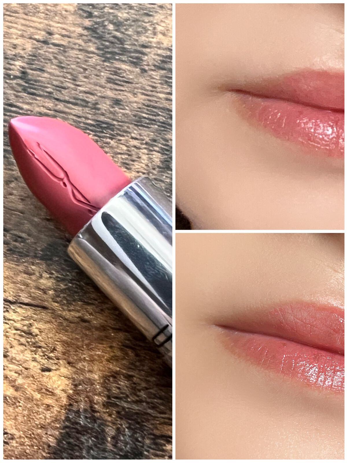 この新色が最近の1番のお気に入りです☺️ 春色でツヤ感もあり肌馴染みが良い♥️ 色持ちは食べたりすると落ちてしまう🥲 ティッシュオフをするとほんのり色は残るけど 本来のこの透明感が薄れるので塗り直しするのが 良さそうです😍 バニラのような香りはあるので苦手な方もいるかも。 MACのリップが大好きなので何本も持っています。その中でもベスト3に入りました✨