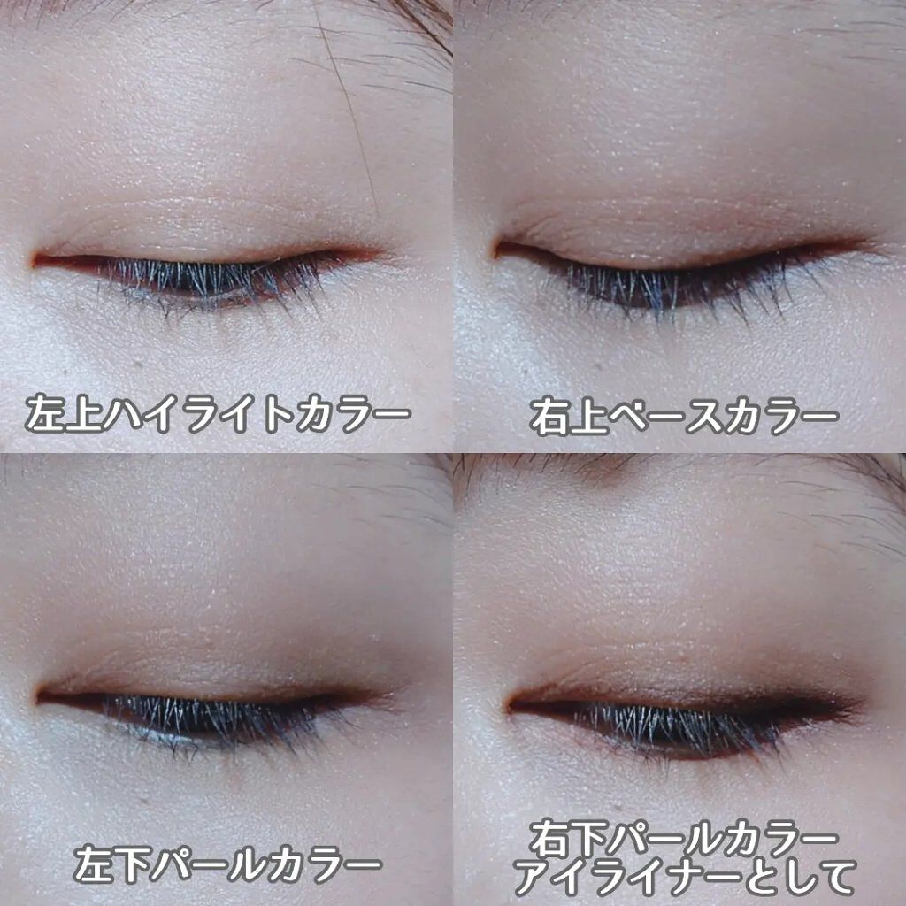 まろやかで甘い上品な目元に❤ 右上のほんのり赤みのあるブラウンをアイホールに入れ、 左下の細かいパールが入ったブラウンを二重幅に重ねます。 時間がない日のメイクならこの2色だけも とっても可愛い優しい甘さの目元が完成🙌 しっとりした粉質で指でも塗りやすい✨ 右下の締め色をアイライン程度に入れて、 左上のグリッターを真ん中にぽんぽんのせます。 このグリッターがキラキラきれい! 立体感がでて、上品なツヤ感と 抜け感のある目元が簡単に仕上がるよ♪ 赤みも強すぎないので イエベ、ブルべ関係なく使えるカラーだと思います😊 パケの色も可愛いし、 捨て色のない毎日使えるパレット💕 限定色だから ぜひゲットしてみてね!