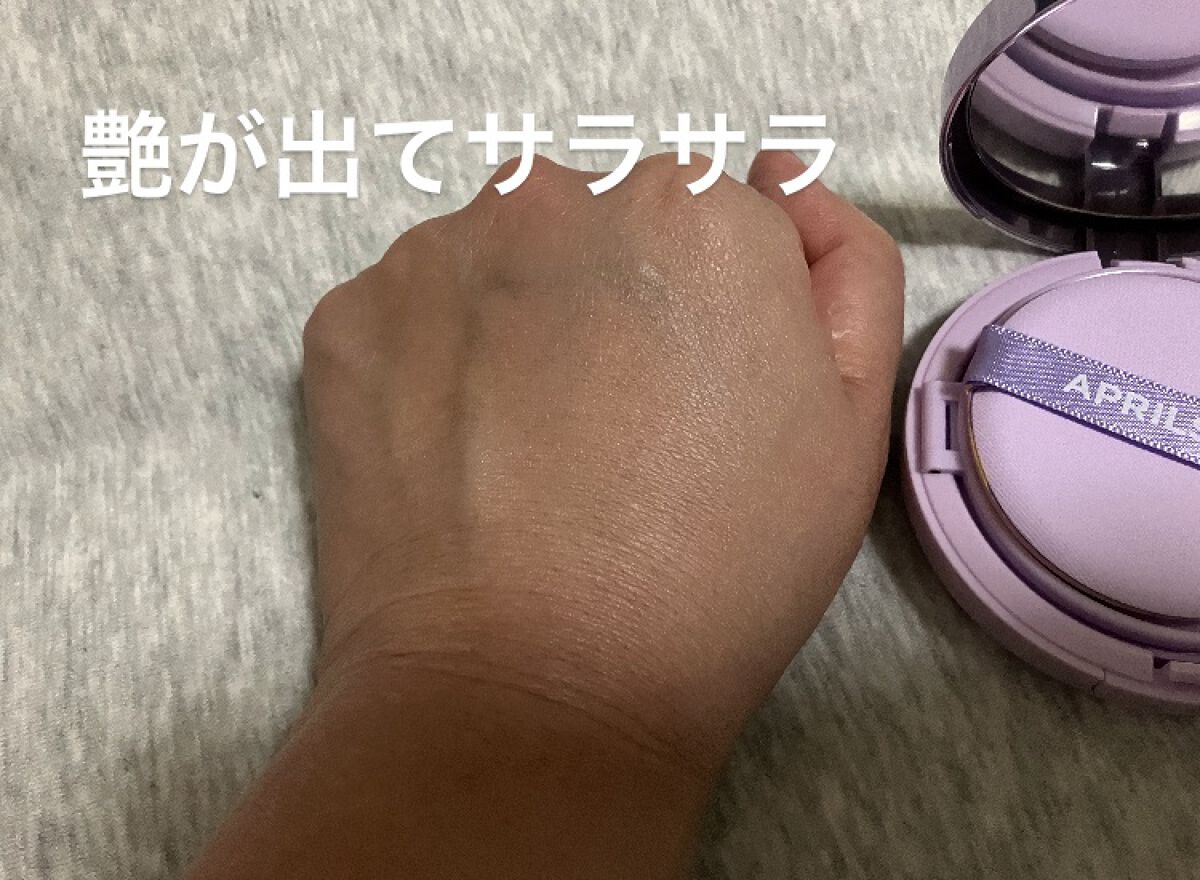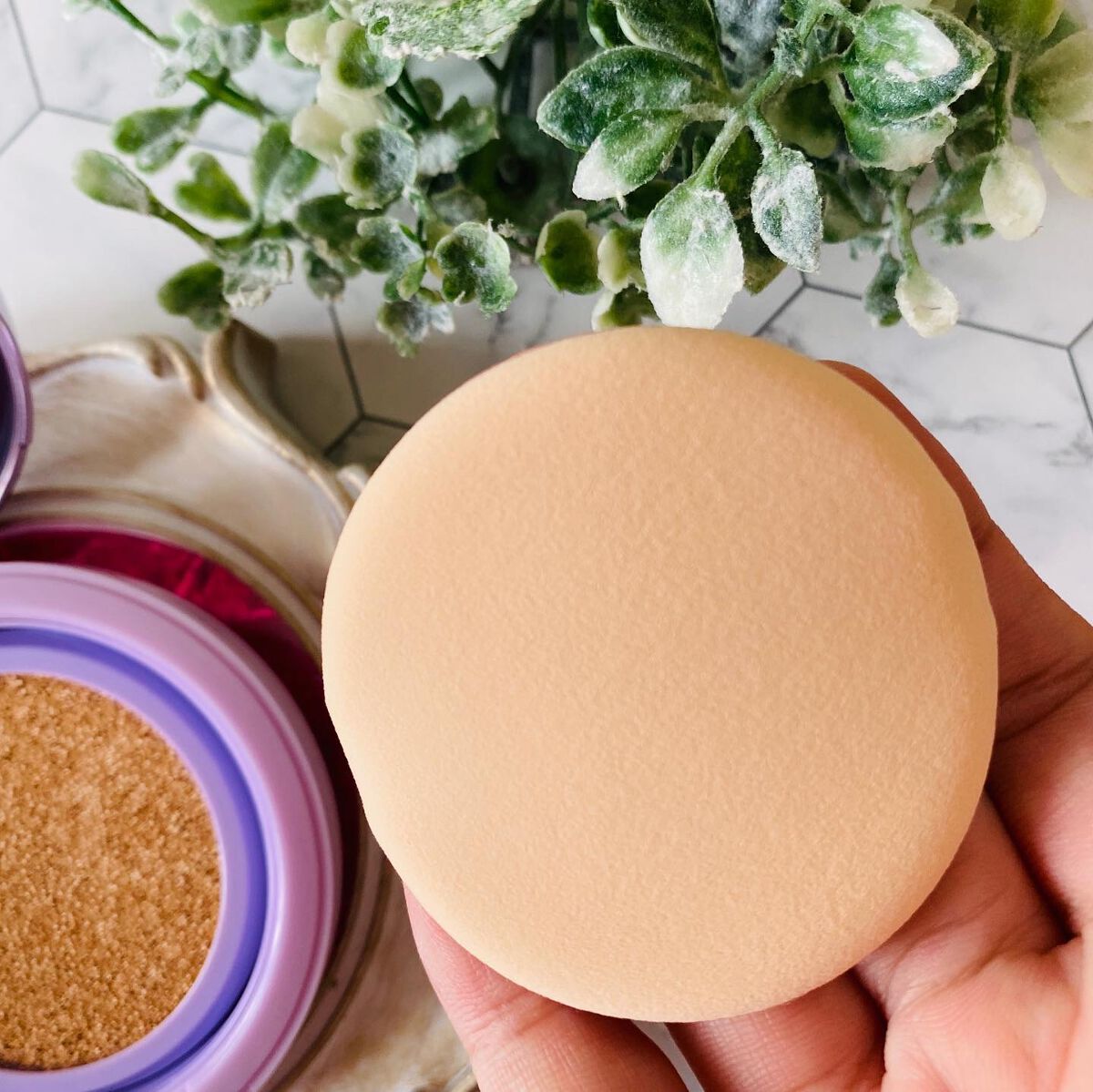 サラッとした付け心地で程よい艶がでて色ムラやシミを自然にカバーしてくれます。 乾燥はしませんでした。 マスクをつけていてもマスクにつきにくく、サラッとしていました。化粧崩れしにくいクッションファンデーションです。 ツボクサエキスやヨモギエキスが配合していて、スキンケア効果があるのが嬉しいですね。 ライラック色のパクトがおしゃれで持っていたくなりますね。