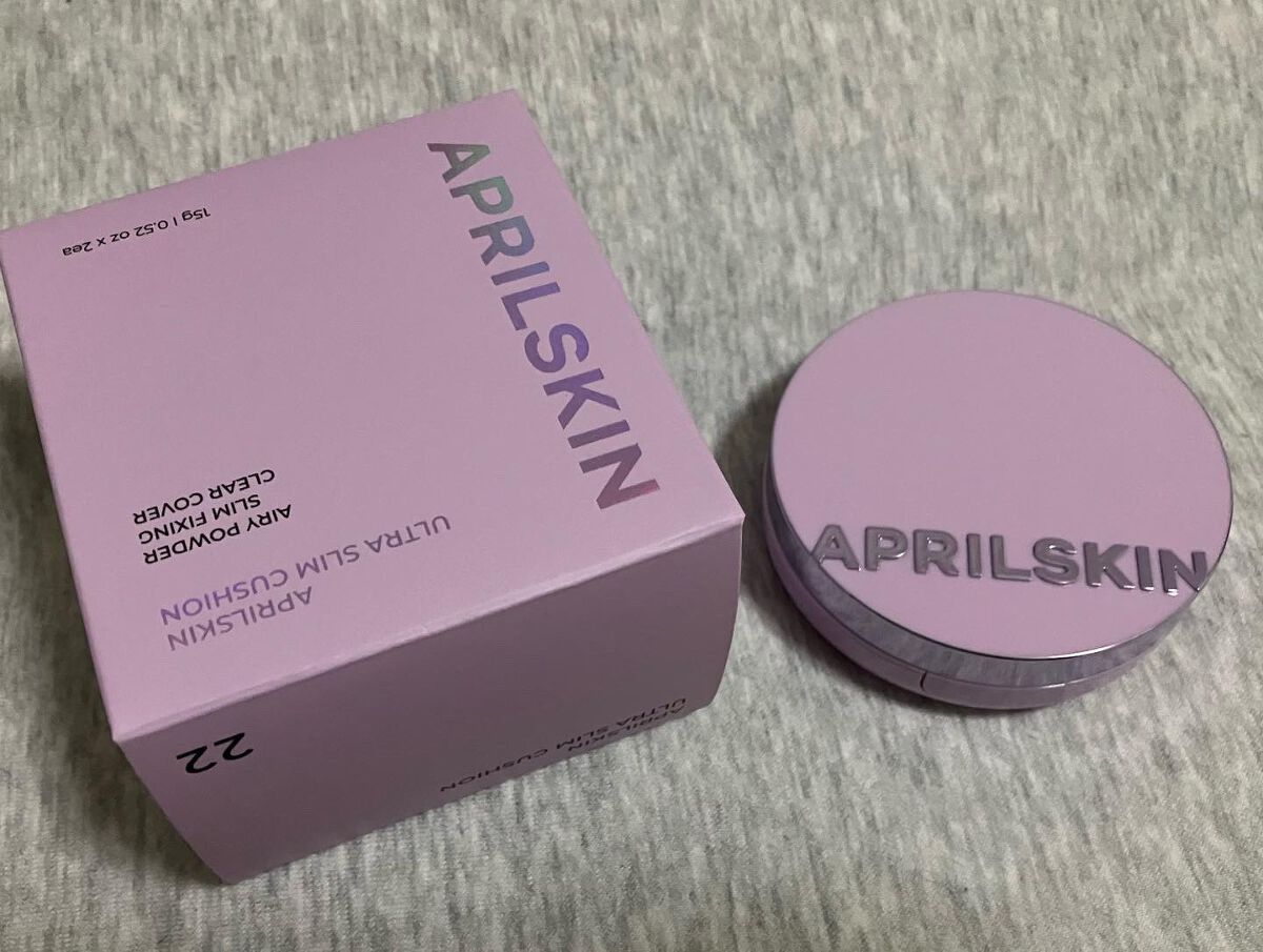 エイプリルスキンウルトラスリムクッションを使ってみました。色は#22ピンクベージュです。サラッとした付け心地で程よい艶がでて色ムラやシミを自然にカバーしてくれます。つけた後はサラサラしていますが乾燥はしませんでした。マスクをつけていてもマスクにつきにくく、サラッとしていました。化粧崩れしにくいクッションファンデーションです。ツボクサエキスやヨモギエキスが配合していて、スキンケア効果があるのが嬉しいですね。ライラック色のパクトがおしゃれで持っていたくなりますね。