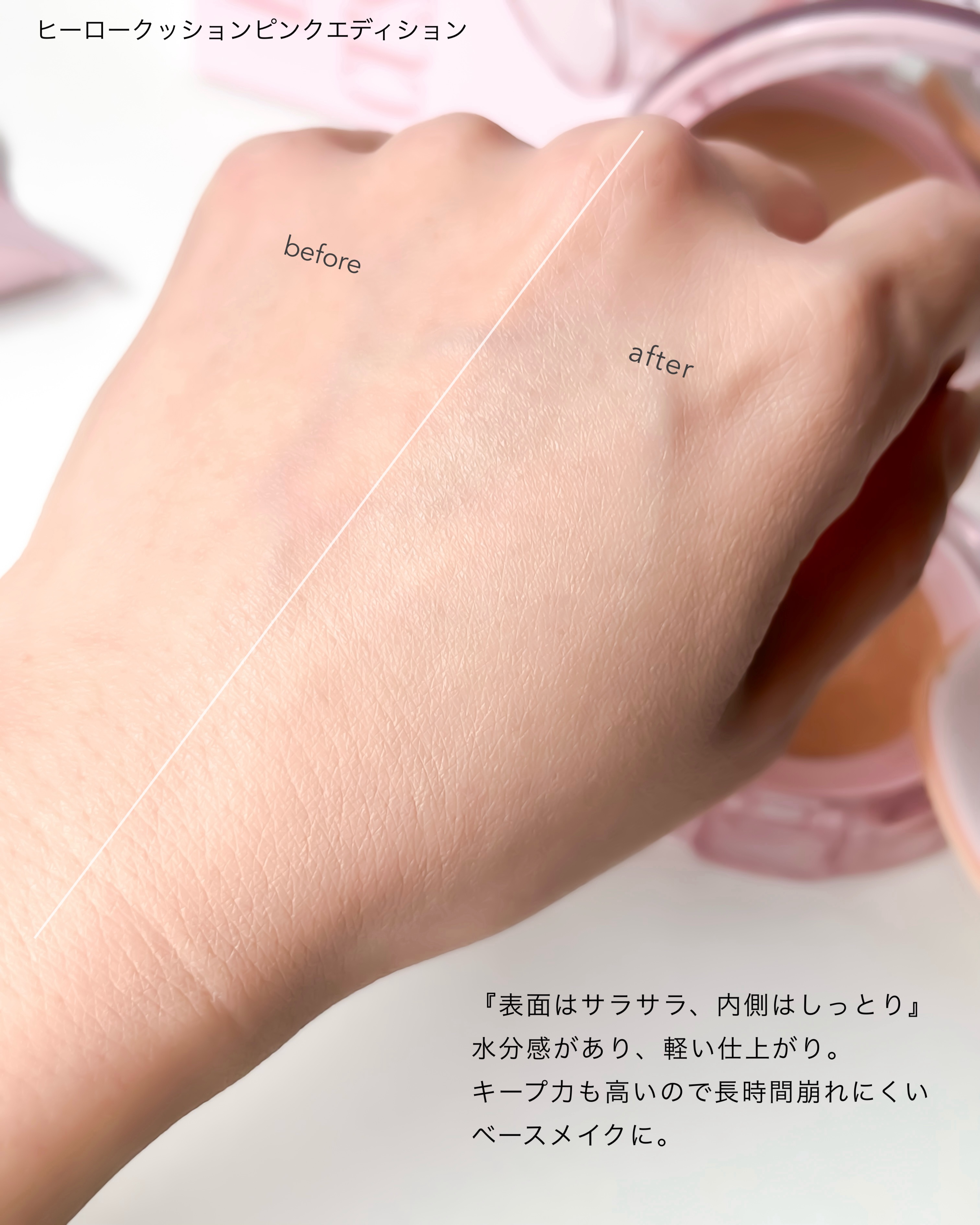 カバー力しっかりあるのに白浮きせずにナチュラル!!!! ゆで卵のようなつるんとした肌の仕上がりに思わず声が出ました♡ このヒーロークッションは崩れにくくて、ずっとつやつやナチュラルに盛れてます♡ 私はくすみやすい肌なので、22のピンクベージュを使っています。 毛穴とかも綺麗にカバーできるので綺麗なお肌に見せたいって方はすぐにでも使ってほしいです♡