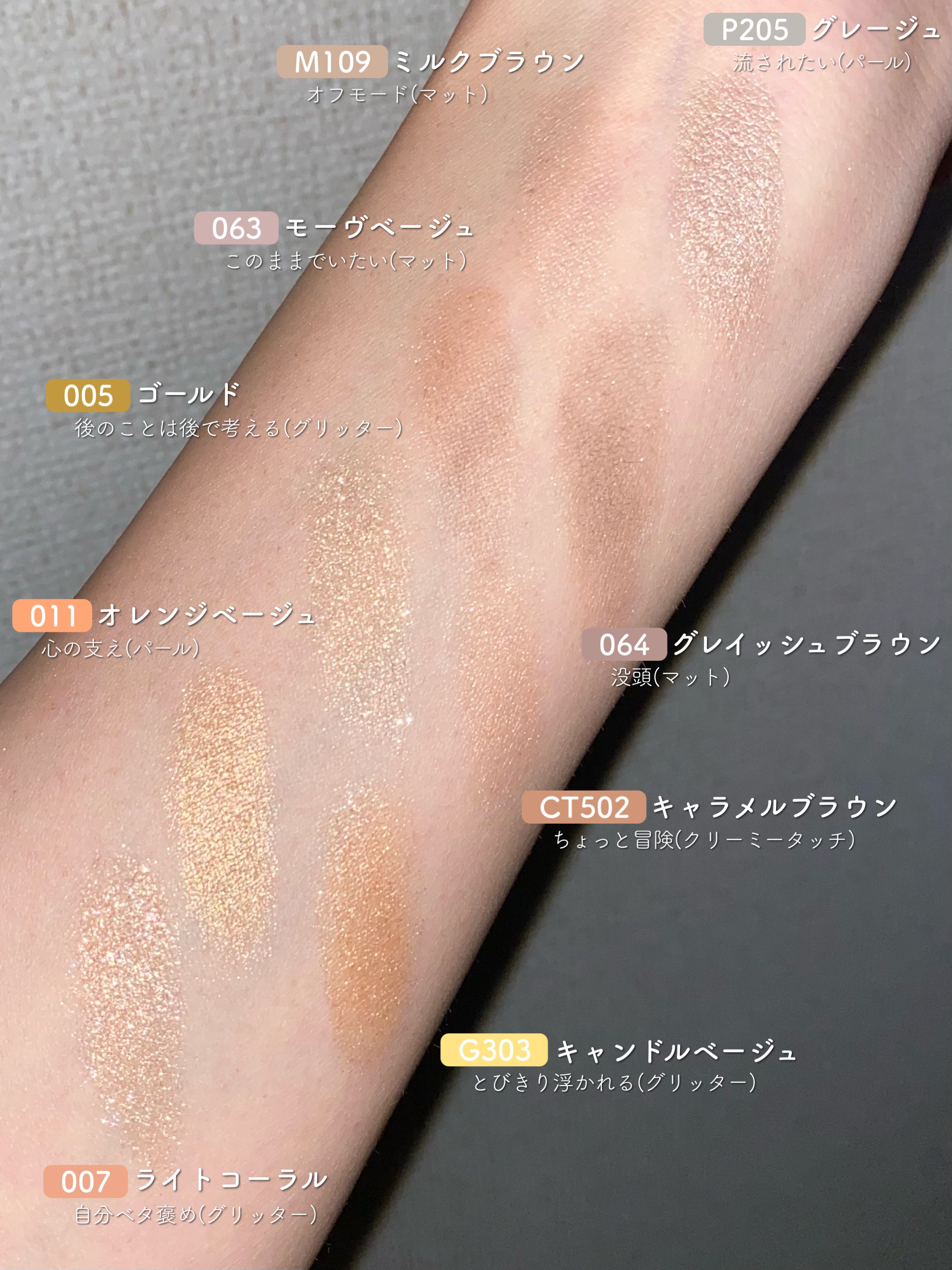 P209【パール】モーヴピンクくすんだピンクにチラつく青ラメがたまんねー!! 早く太陽光で愛でたい… P207【パール】サーモンピンクオレンジ味強めのピンクにゴールドラメは 多幸感が約束された組み合わせ♡ イエベ春メイクの主役に使いたい! M108【マット】ブルーハワイアンシルバーラメの入ったマットカラー この黄味のあるブルーが澄んだ海みたいで美しい… ブルーシャドウって実は一つも持ってなかったんですが 新たにブルーメイクに挑戦したくなったカラー! 024【グリッター】ダークブラウンブラウンとありますが私の目にはグレーっぽく見えます ザクザクラメのグレーなんて今時期にピッタリすぎる♡