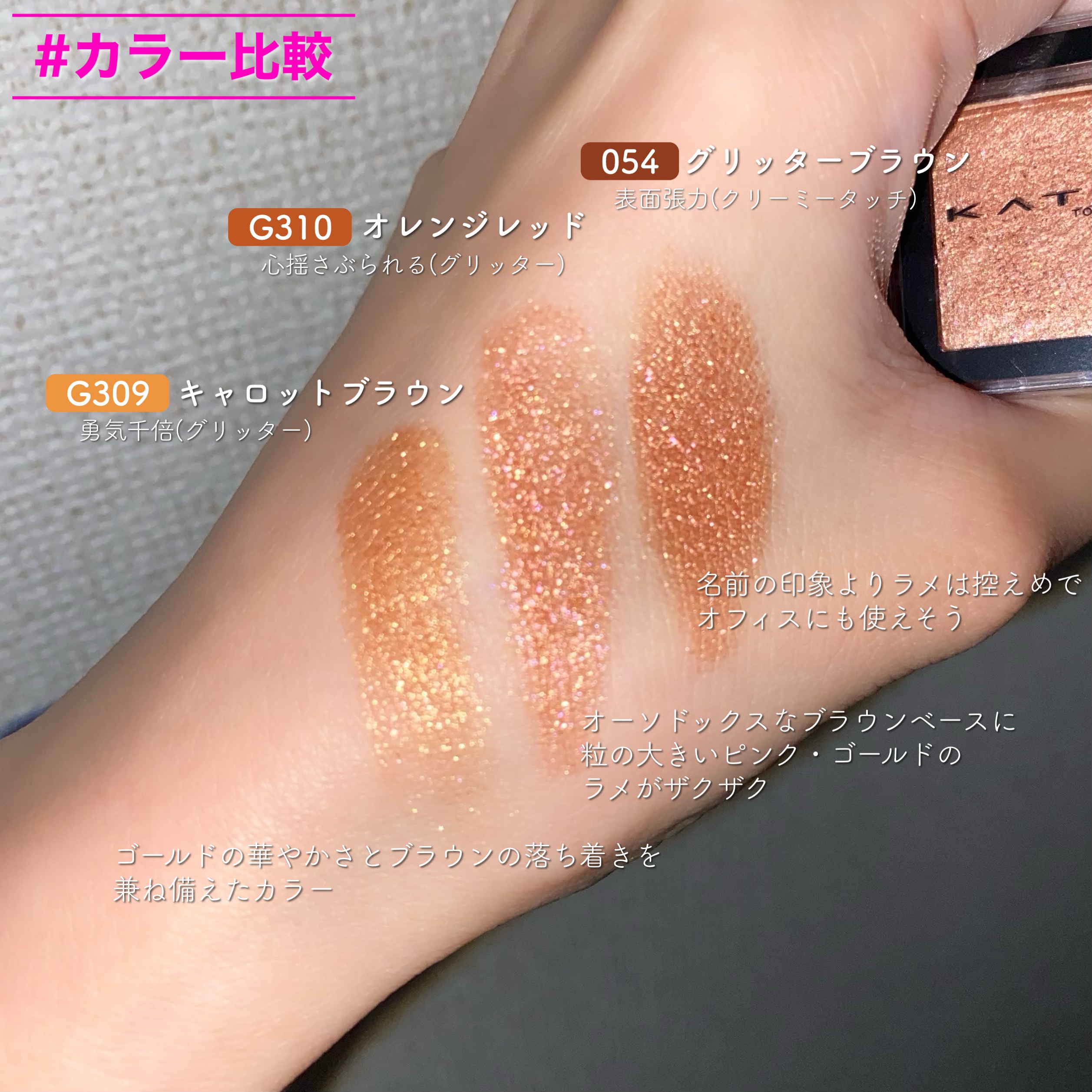 P209【パール】モーヴピンクくすんだピンクにチラつく青ラメがたまんねー!! 早く太陽光で愛でたい… P207【パール】サーモンピンクオレンジ味強めのピンクにゴールドラメは 多幸感が約束された組み合わせ♡ イエベ春メイクの主役に使いたい! M108【マット】ブルーハワイアンシルバーラメの入ったマットカラー この黄味のあるブルーが澄んだ海みたいで美しい… ブルーシャドウって実は一つも持ってなかったんですが 新たにブルーメイクに挑戦したくなったカラー! 024【グリッター】ダークブラウンブラウンとありますが私の目にはグレーっぽく見えます ザクザクラメのグレーなんて今時期にピッタリすぎる♡