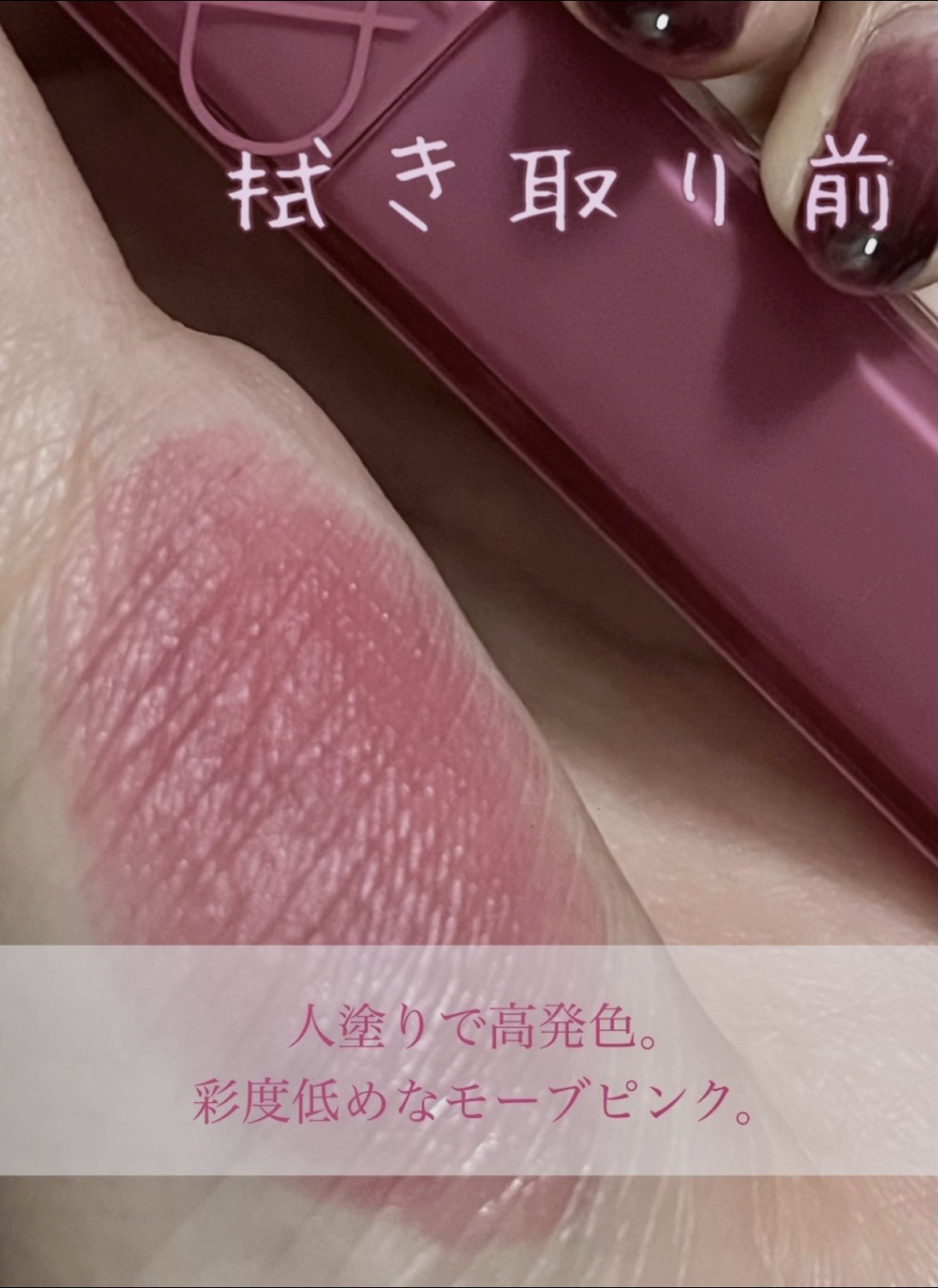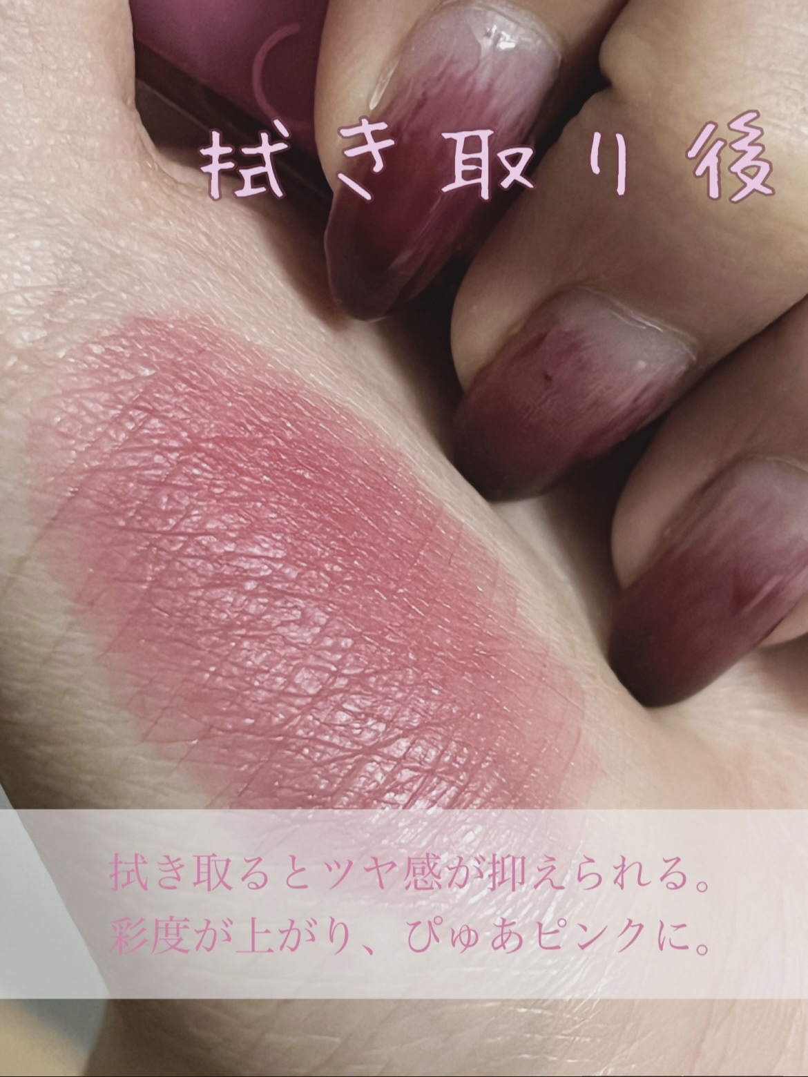 ラズベリーとミルクを混ぜたような甘いピンクです。 重ね塗りしても重くならず、瑞々しいフルーツのような軽さは消えないのに非常に高発色でいいとこ取りのリップです! 唇に塗って5分ほど待ち、軽くティッシュオフすれば色落ちもかなり防げます。 鏡を見るたび気分が上がるほど、かわいい色味なので是非試してみてください!
