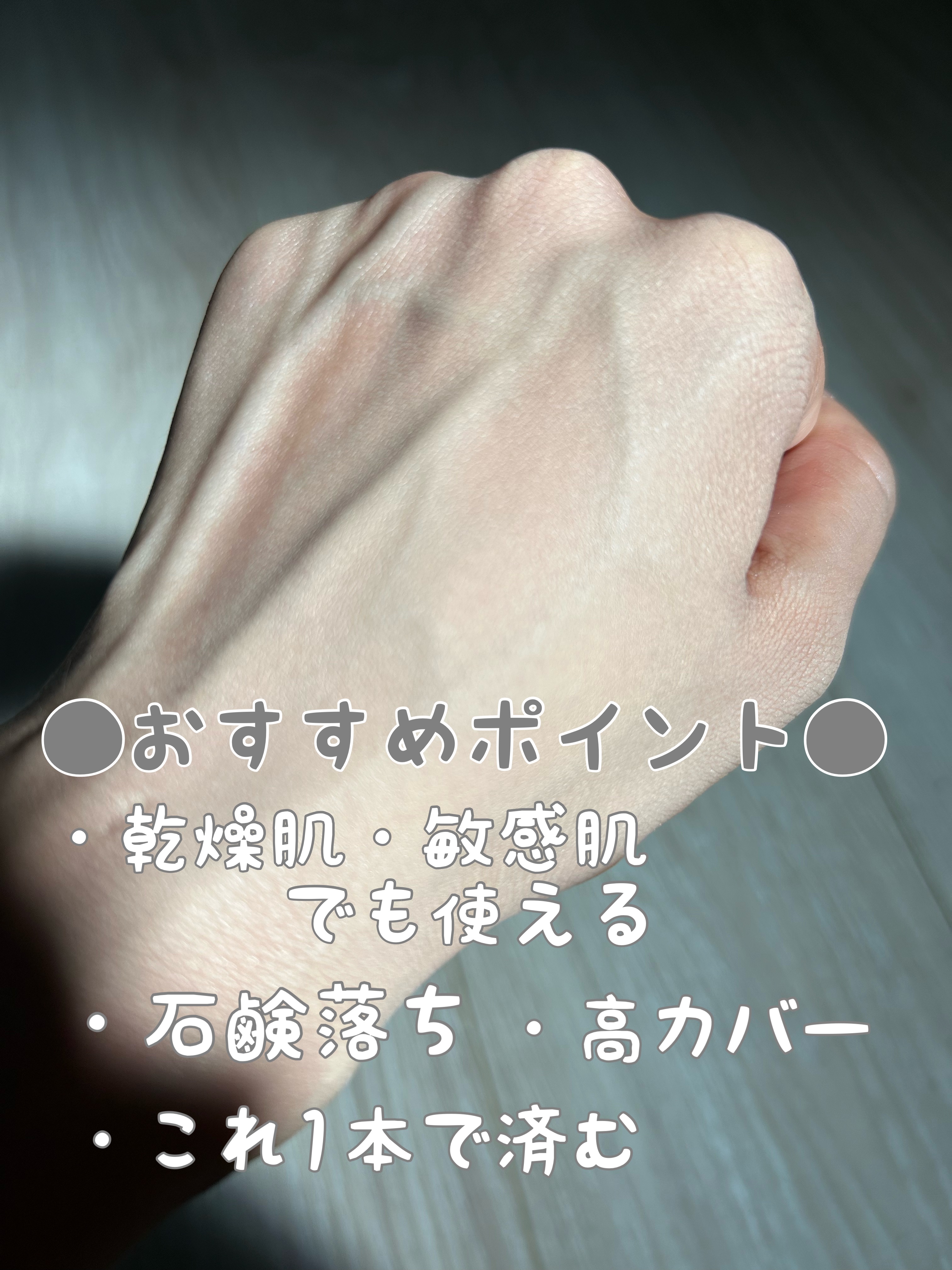 ミネラル成分と12種の美容保湿成分配合で、乾燥・敏感肌のわたしでも乾燥、荒れることなく使用できています。 しっかりハイカバーでニキビ跡もそこそこ隠してくれ、セミマットな肌に仕上げてくれます✨ 濡らしたスポンジなどを使用すると伸ばしやすかったです。