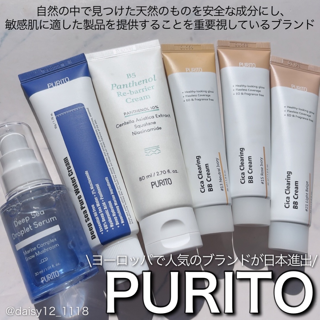 ※PURITOのプロモーションに参加中です。PURITO様よりPURITOの人気商品6点をいただきました🙇♀️・シカクリアリングBBクリーム(13/15/21)・ディープシードロップレットセラム・ディープシーピュアウォータークリーム・B5パ...