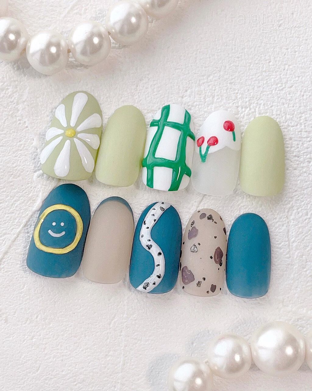 韓国で大人気♡ネイルアート用ペン/allthatnailDrawingPen-ドローイングペン-12色セットオールザットネイルより韓国で大人気のドローイングペンが新発売𓈒𑁍......................................................#ドローイングペンとは初心者の方でも簡単にお好みのデザインやパターンを書くことができるネイルアート用のペンです。カラーバリエーションは⚫︎12色のセット(私が使用しているのはこれです)⚫︎パステルカラー6色セット⚫︎ナチュラルシリーズ12色セットがあります。◇使用方法◇①ベースのカラーを硬化後、未硬化ジェルを除去します。②ドローイングペンでお好みの模様を描きます。➝ネイルリムーバーを使えば、お好みのデザインが完成するまで描き続けることができます。③ペンで描いた模様が乾いたらトップジェルを塗って硬化して仕上げます。......................................................ドローイングペンを使って韓国ネイル風のデザインを作成しました🌿上のデザインはお花、チェック柄、さくらんぼ。下のデザインはニコちゃん、うねうね、ブラウンの斑点がドローイングペンで描いたものです。(中指薬指の黒の模様はダルメシアンフレークを使用しました。)白背景にはもちろん、濃いカラーの上から塗ってもしっかり発色するのでネイルアートの幅がぐんと広がります🌈ペン先は0.7mmなのですが、ゆっくり描くと線が太くなるので細い線を描きたい時は迷いなくサッと描くのがポイントです🌝動画ものせているので描き心地など参考になれば嬉しいです♡【使用色】〈上デザイン〉DnaGelMG09DnaGelMWB02〈下デザイン〉DnaGelS09DnaGelMBL06【パーツ等】allthatnailダルメシアンネイルグリッタードローイングペンはallthatnailの公式サイトで購入可能です。すごく楽しいアイテムなのでぜひチェックしてみてください🍒#オールザットネイル#allthatnail#ネイルアートペン#ネイルアート用ペン#ネイルアート#セルフネイル#ジェルネイル#簡単ネイル#手描きネイル#韓国ネイル#キャラネイル#マットネイル#カラフルネイル#ぷっくりネイル#フラワーネイル#ダルメシアンネイル#ショートネイル