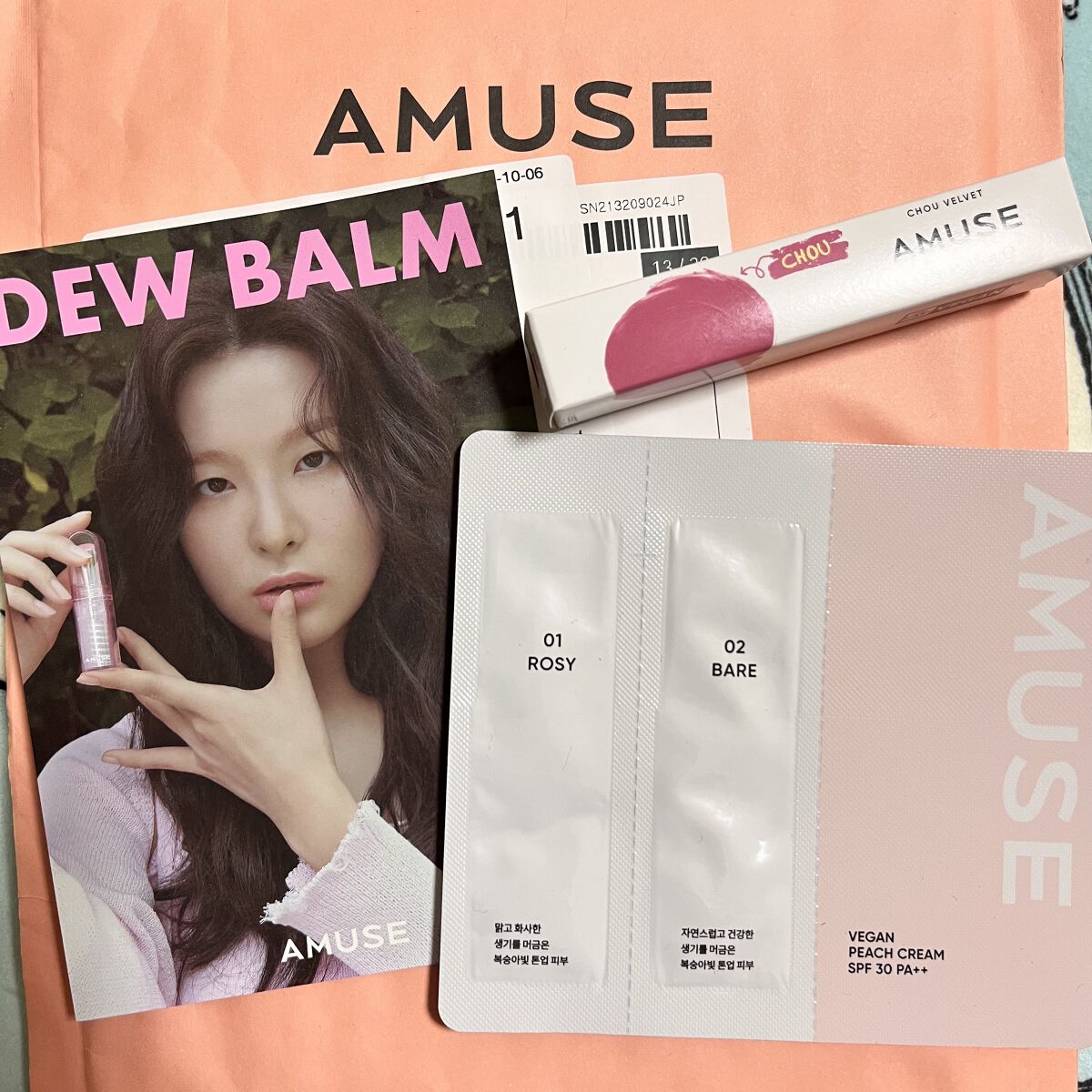 最初に塗布してるのが01モモシュー♡ ミルキーピンクっぽいけど、青みに寄ってないのでほんとに桃のような発色🍑 ニュートラルで、深みのない可愛い系のカラーです。 次に塗布したのが08プラム♡ 少しだけくすんだモーヴカラーで、ブルベの肌にぴったり! ダーク感のないパープルピンクだから、ちょっと大人っぽいのに爽やかに可愛く仕上がるからお気に入り🍇💕 マットリップなのに、シュークリームのようにふわふわ軽いテクスチャーで着け心地にストレス無しです✨ 少しだけツヤが残るようになってて、保湿力もちょっとあります。 ティントだからマスクとの相性も良くておすすめ! アミューズの世界観が詰まった、可愛いパッケージとカラー展開にときめくお気に入りリップです💞