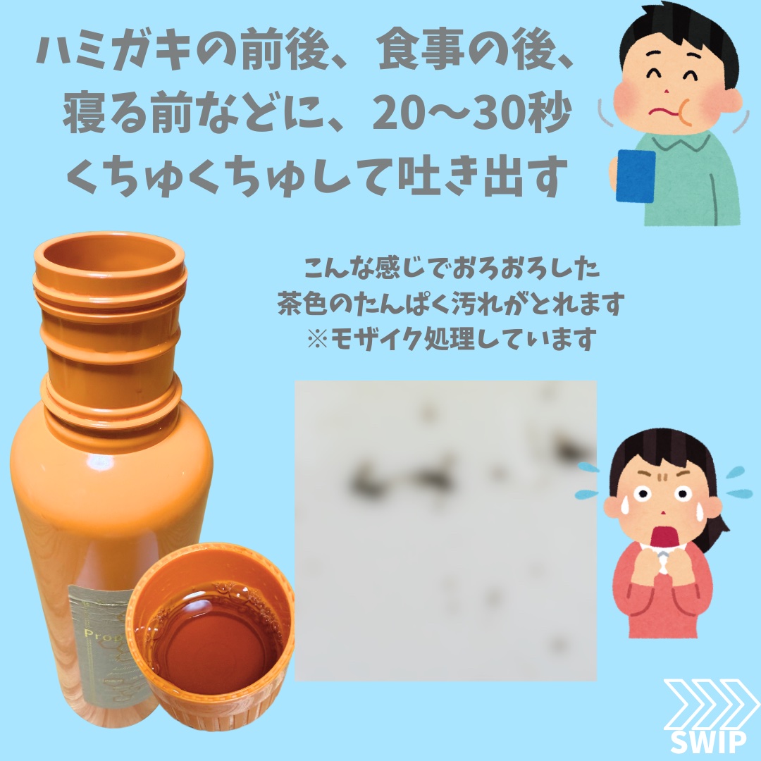 プロポリンスは口臭の素となるタンパク質を固めてくれる✨ たった20〜30秒ゆすぐだけでお口を綺麗にしてくれます☺️ 液は茶色です! 爽やかなミントの味です😀 林檎等の酸味っぽさも少し感じます 口をゆすぎ吐き出すと茶色の汚れが出てきます! 汚かったので3枚目はイラストです🥲 気になる方は検索されたら出てきますよ ゆすぐ時の注意なのですが、あまり唾液を混ぜないようにした方が汚れがよく見えるのでオススメです😃 注ぎ終わりキャップを閉めた時に液がこぼれるのがちょっと😅と思います 拭いたら大丈夫なのですが🙂 簡単に口臭予防が出来るのでオススメです❣️