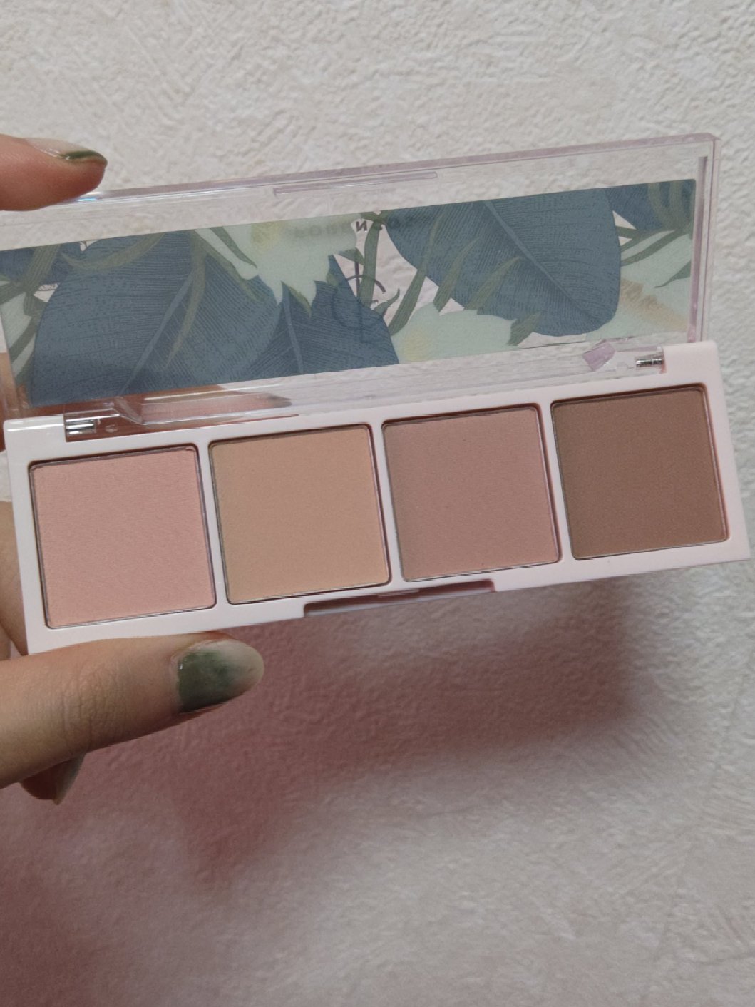 お花の保護フィルムが入っていてパッケージもかわいい横長4色アイシャドウパレット。 粉質はどれもさらっと軽くてふんわり瞼が色付きます。肌への密着感は良い意味であまりないかなと思いました。(しっかり発色というよりふわ〜とした仕上がり) このシャドウが他のコスメと違うところはこの中に入っているラメがすごく大粒という部分!まばらな大きさのラメがたくさん入っていて、目元を色付けながらキラキラも一緒にのせることができます。 マット+ラメはやはり通常のシャドウより粉飛びがしやすいです。指で丁寧に塗ると綺麗に仕上がるのでブラシやチップではなくぜひ指で…! 私の好みが同じな方はこのパッケージ、ドンピシャではないかと思います!!大粒ラメが入っていて割と珍しい仕上がりなのでたくさんの方に試してみて欲しいです✨