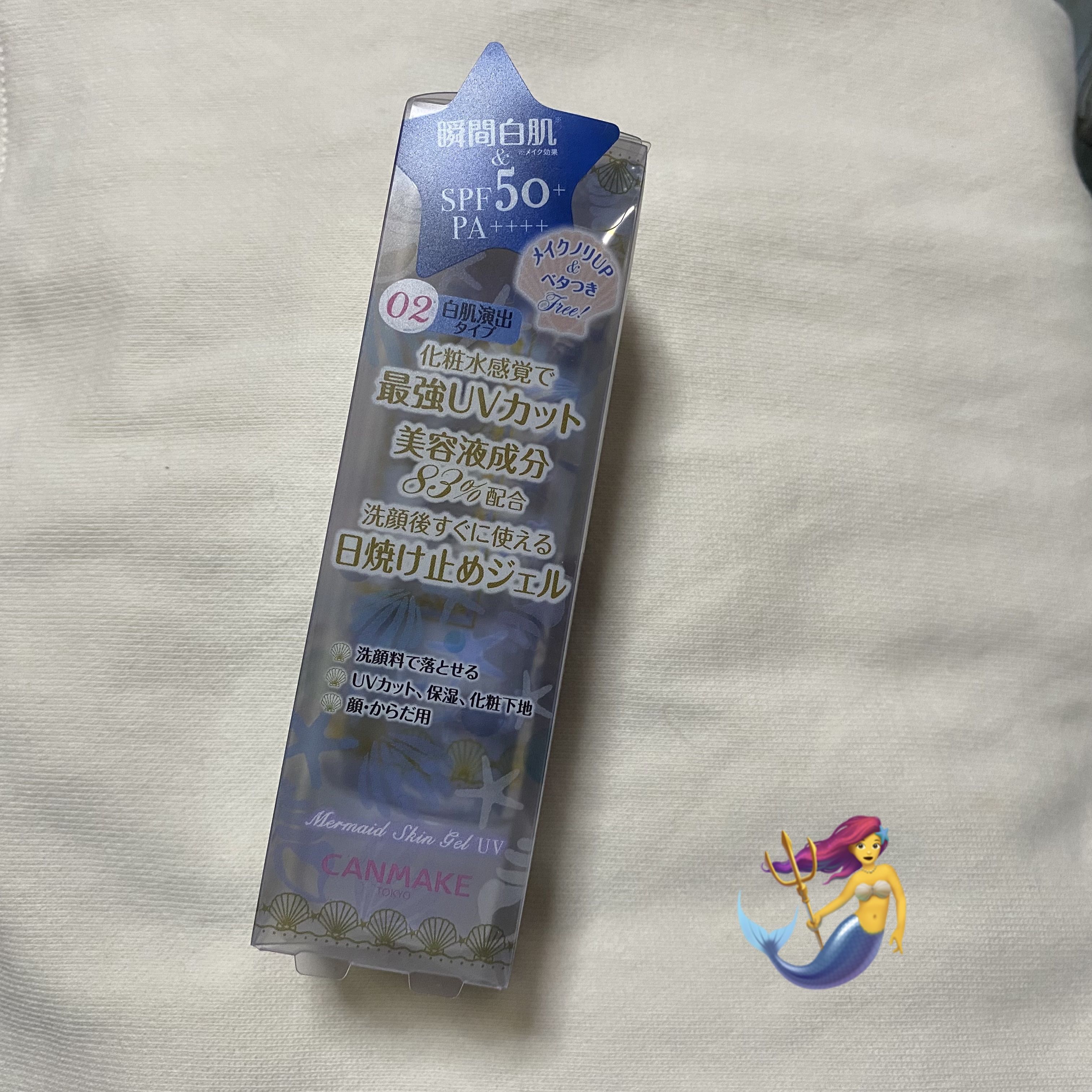 はじめて購入させて頂きました!!めちゃくちゃトーンアップするし、メイクノリよくなるし、、とにかくおすすめです!リピありかも❤️❤️キャンメイクマーメイドスキンジェルUV02ホワイト