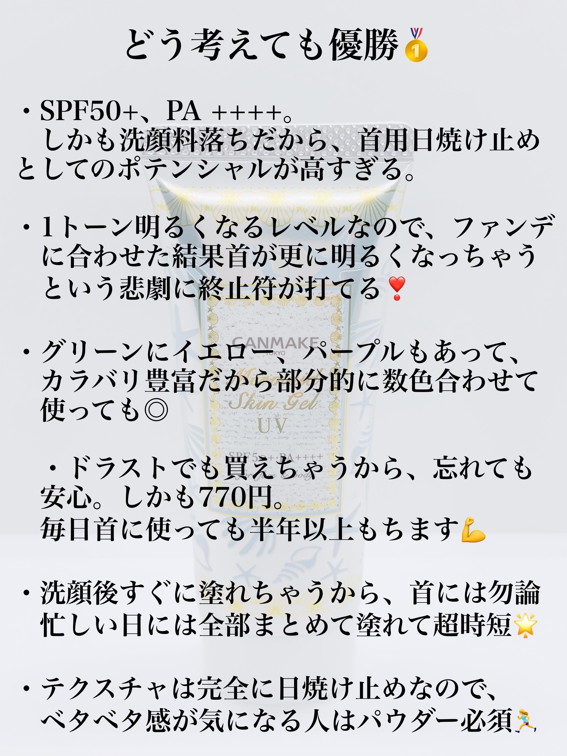 【首用日焼け止めの最適解】キャンメイク マーメイドスキンジェルUV02 ホワイト¥770首用日焼け止めに求めるものを考えたときに、・770円というコスパの高さ・SPF50+PA++++・洗顔料で落ちる・1トーンくらいのトーンアップ・美容液成分配合で、洗顔後すぐ使える・からだだけではなく、顔にも使える・もちが良くて色んなところで買えるこれを全て兼ね備えたこちらが理想、というかどんなに色んな商品を使ってみても結局こちらに戻ってきてしまう。。というような商品。文字にすると本当に理想的すぎて完全に墓コスです🪦#プチプラコスメ#日焼け止め下地#スクールメイク