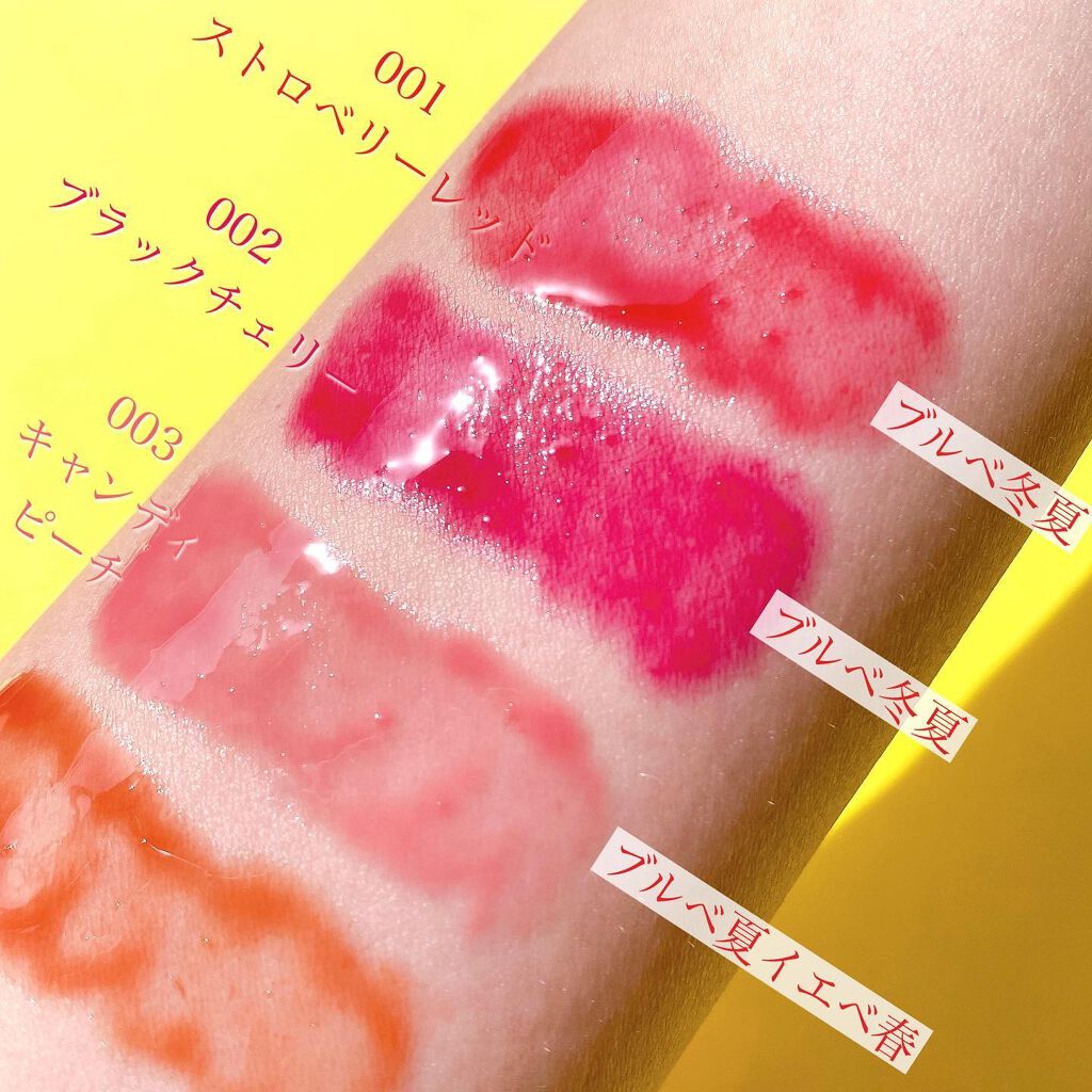 ✔うるおいさらさら水感リップ ✔日中のリップケアとしてもオススメ ✔濃密ベリーの香り ✔センシュアルブラックチェリー ✔赤だけど青みピンク感のあるカラー ✔ラメ入りグリタリーリップ ✔いつものリップに重ねてニュアンスチェンジ ✔日中のリップケアとしてもオススメ ✔濃密ベリーの香り ♡唇がうるうるになる ♡透明感のある可愛いカラー ♡002番は青み感が強いのでイエベの私には ガッツリ塗ってしまうと似合わないので普段使っているリップの上から、ポンポン置きで塗って ぼかすといい感じになった! ♡006番はラメ入りでキラキラしててとても可愛い どんなリップに重ねても可愛いのでお気に入り ♡可愛くて日中ケアもできる最高なリップ