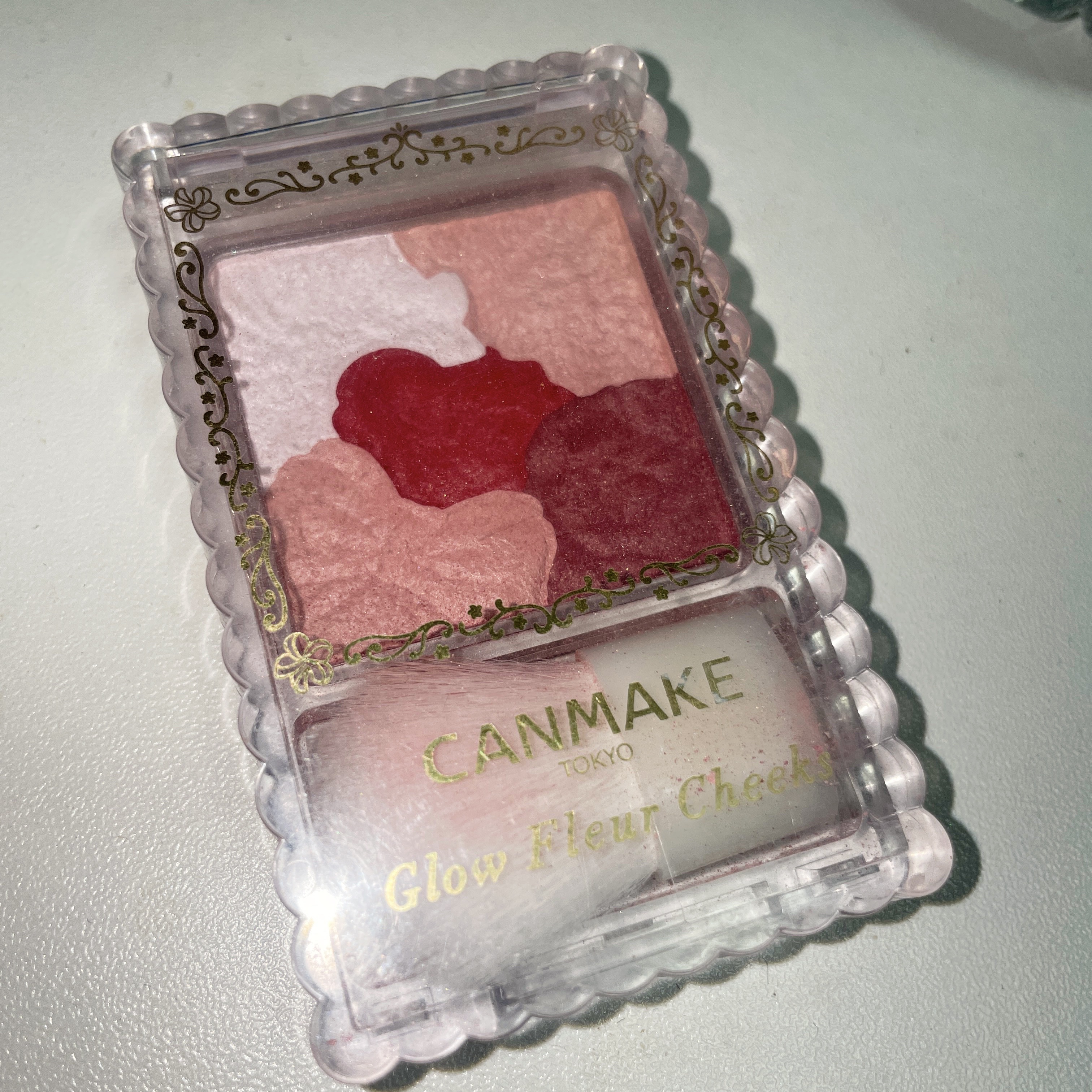 キャンメイクの名品であるグロウフルールチークス! こちらの旧カラーは大人っぽさもあり、あどけなさもありな色味でめちゃくちゃ可愛い...! 塗ってみると紫みが入ってるようなピンクで、肌が白く見えるような血色カラー! 薄いピンクでベースを整え、中心と右下のカラーで重ねれば綺麗な頬が作れます💕 左上のツヤ感をプラスしてくれるパウダーを重ねると、きれいな肌に見せてくれるので私は大好き✨ 時間が無い時は全部ぐるっと重ねてぼかしまくってます←でもなんだかんだこのやり方が結構綺麗で1番好き🙃 ふわっとした血色感が可愛い。 自分好みのチークが作れる。
