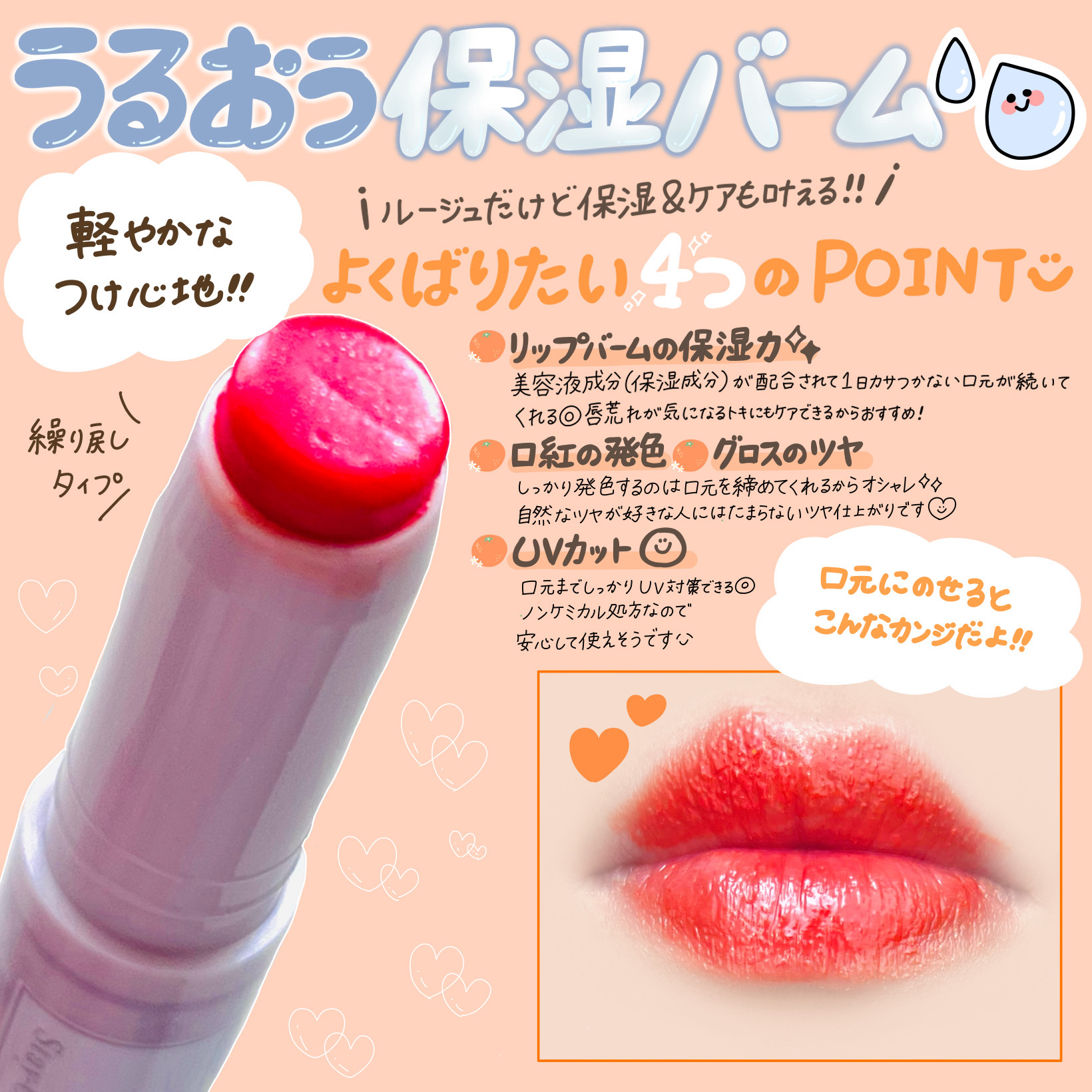 きゃんめいく使いやすい口紅潤うし、保湿効果があるきがしますコーラルかわいいいろ