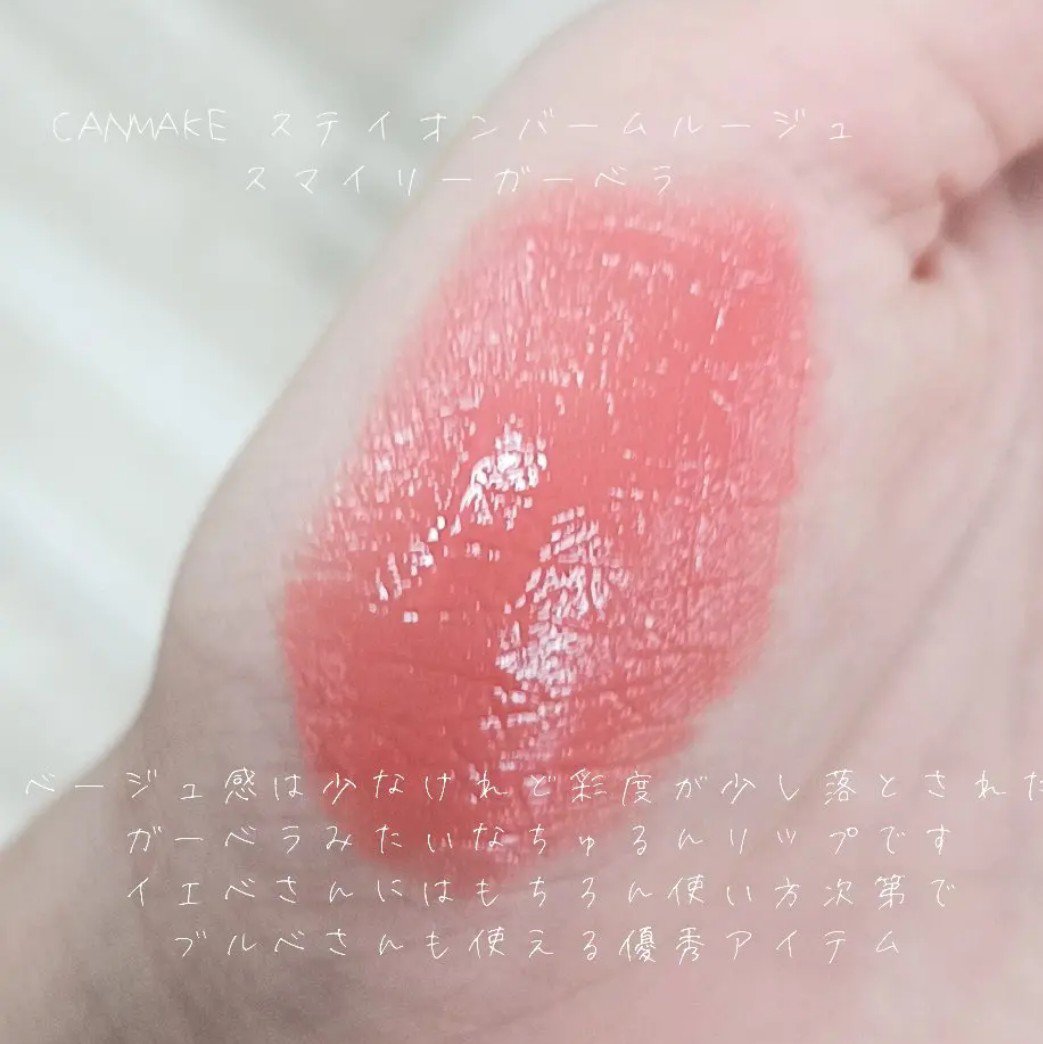 キャンメイクステイオンバームルージュ02スマイリーガーベラ2本目はこちら、スマイリーガーベラという明るいオレンジ色のリップです。こちらはティントタイプでは無いのですがそれでも色持ちは良く、何より色が可愛くてかなり気に入っています。オレンジ系の...