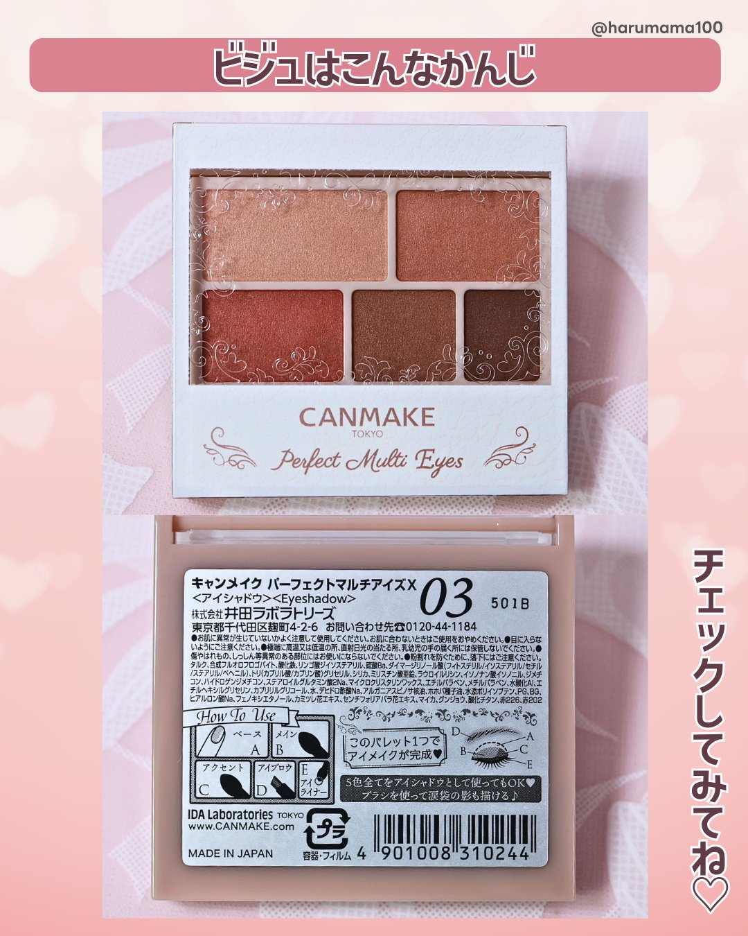 【くりっと丸い目元に♪ほわほわ秋色マットパレ】───────────────キャンメイクパーフェクトマルチアイズ03アンティークテラコッタ参考価格858円(税込)───────────────キャンメイクの大人気アイシャドウ!マットだけを5色セットにしたシリーズでアイシャドウ、アイブロウに使えるんだそう〜♡今回使った「03アンティークテラコッタ」のカラーはぬくもり感たっぷりのブラウン系。同色系統のセットだから順番に重ねるだけでグラデが作れて簡単だよー👍️特に、赤みのアクセントと締め色が使いやすいの🙌私はまぶたが重ためなんだけど、これを使うとくりっと丸い目元に仕上がって満足♪ぜひチェックしてみてねー💕───────────────#コスメ購入品#내돈내산#キャンメイク#CANMAKE#アイメイク#アイシャドウ#eyeshadow#秋メイク#秋色コスメ#垢抜けメイク#秋の先取りコスメ#ドラコス#プチプラ