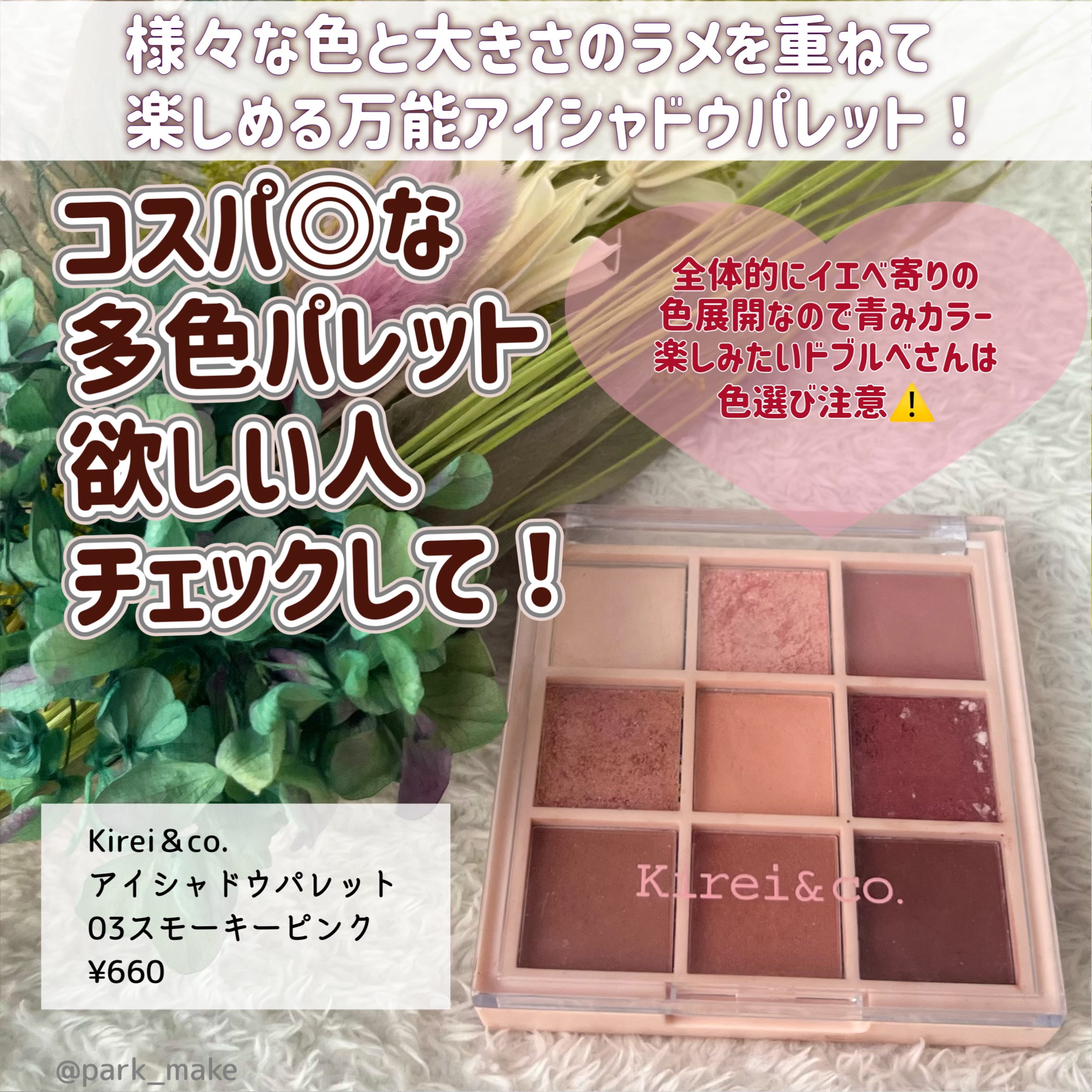 \\Kirei&co.アイシャドウパレット03スモーキーピンク//ALL660円で買えるコスメブランドといえば…Kirei&co.✨その中でも大人気商品のアイシャドウ使った事ある方いますか?なんと660円なのに9色も入っているんです!1色あた...
