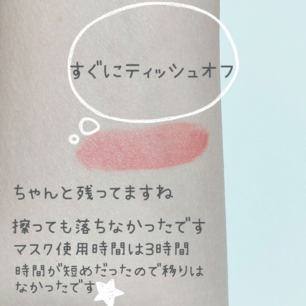 見た目より発色は柔らかくふんわりとした印象! シアーな透け感発色が可愛いです💓 マットカラーも発色が強すぎず使いやすい◎ ◎ 涙袋にぴったりなスティックシャドウ✨ みずみずしいツヤ感×鮮やか発色なティント💄 色残りもしっかりで驚いた…‼︎ スルッとひと塗りで高発色でした☺️