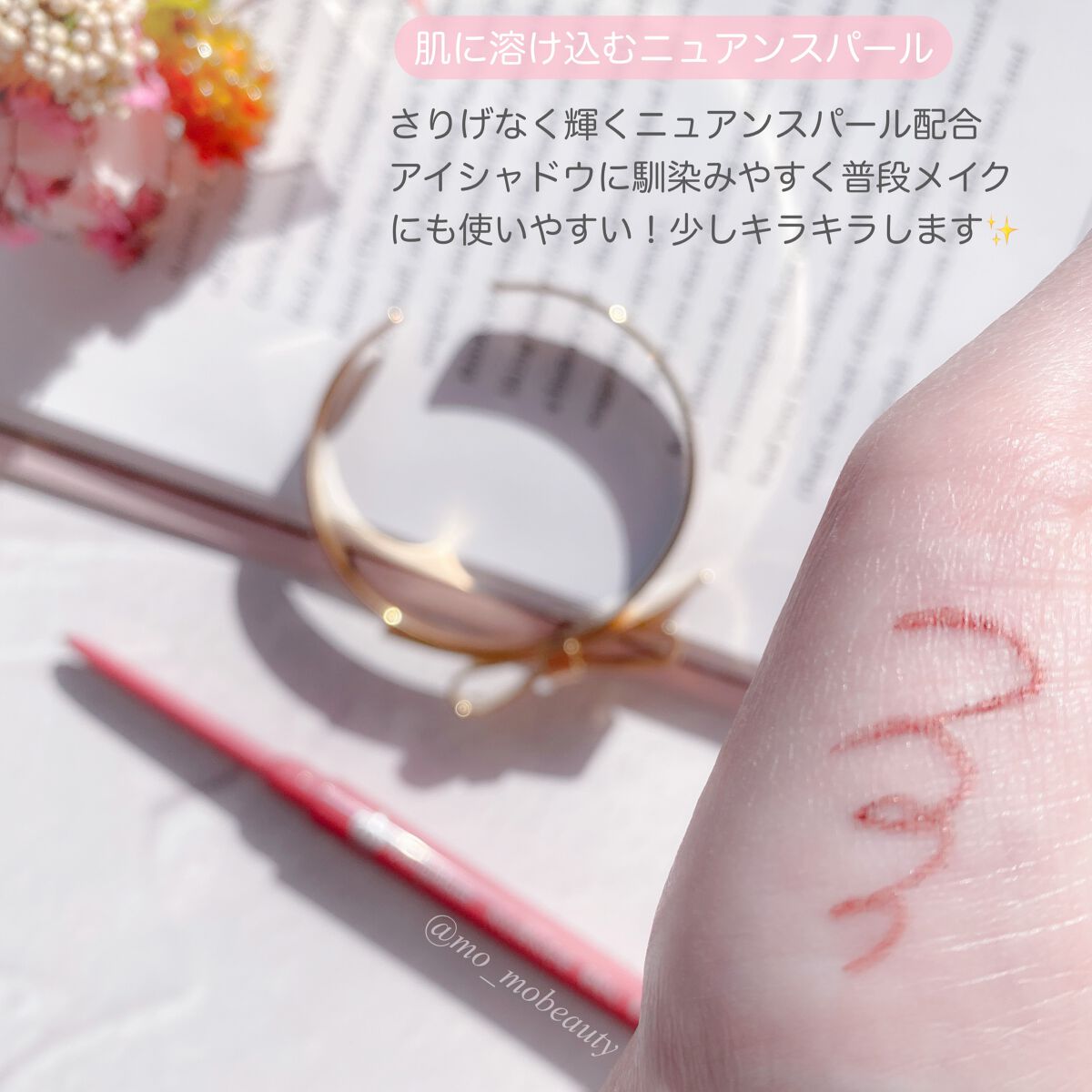 チラチラとさりげなく細かいニュアンスパール入っているのが派手すぎず、アイシャドウとも馴染んでとってもかわいいですが、色もまた絶妙です。 ブラウンが入っているので引き算メイクのような弱い色味ではなく、しっかりアイライン効果が出る色なので特別な日用ではなくデイリーに使えます。 赤みブラウンというか、ピンクブラウンというか、ブラウンなんだけどただのブラウンではないという感じなので使いやすくてかわいいです。 1.5mmの極細クリーミータッチ芯なので細かい表現もしやすく、仕上げに細かいところをリキッドで埋めなくてもこれ1本でアイラインが完成してしまいます🥰 なめらかで軽い力でも描きやすく、ウォータープルーブンなので1日過ごしていてもぜんぜん滲みませんでした。 他の色もとってもかわいいので欲しくなってきてきまいます😆💓(4色あります)