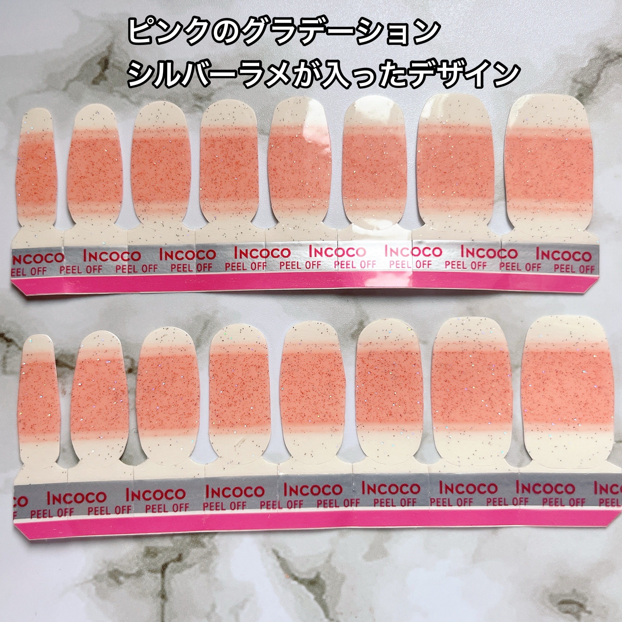 貼るだけマニキュアインココ乾かす時間ゼロ!硬化も不要!ハンドもフットも兼用できる貼るネイル「INCOCO」(インココ)を使ってみました✨️マニキュアでできた「シートタイプのネイル」だから袋をあけるとマニキュアの匂いが。今回使用したデザインはピンクグラデ、シルバーラメが全体的に入ったもの。サイズも6種ほどあります。やわらかいシートだから簡単に破れるので、爪の形に合わせて成形しやすいです✨️私は職業柄手元は難しいので、フットネイルとして使ったよ🎵足は特に小指とか小さすぎて貼るのが難しかったですが、すぐにコツを掴めてササッとできました🤗ピタッとしっかり密着してくれて、触れた感触も塗って乾いたマニキュア❣️みたいだから、ただ貼っただけとは思えなくて仕上がりがすごく自然です😊♡乾かす手間もなくラクなのも嬉しい😉私はさらに上からトップコートを塗って、少しでも耐久がよくなればいいな〜と🥰可愛いデザインが豊富にあるから何種類か揃えておきたくなる〜😍