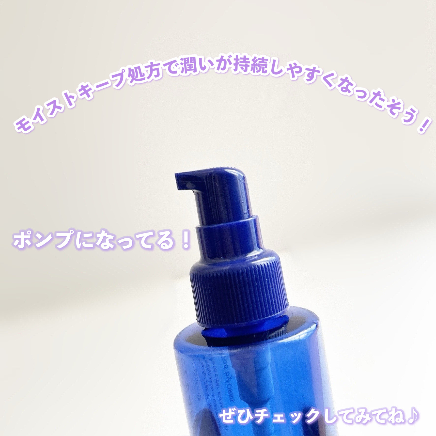 さっぱりとしっとりが選べて、私はしっとりタイプをセレクト❗️ ブルーのキレイなボトルが夏でも爽やかに使えそうな印象♪ パシャパシャ系のお水のようなテクスチャー💡 しっとりするけどベタつかない使い心地で肌なじみもGood✨
