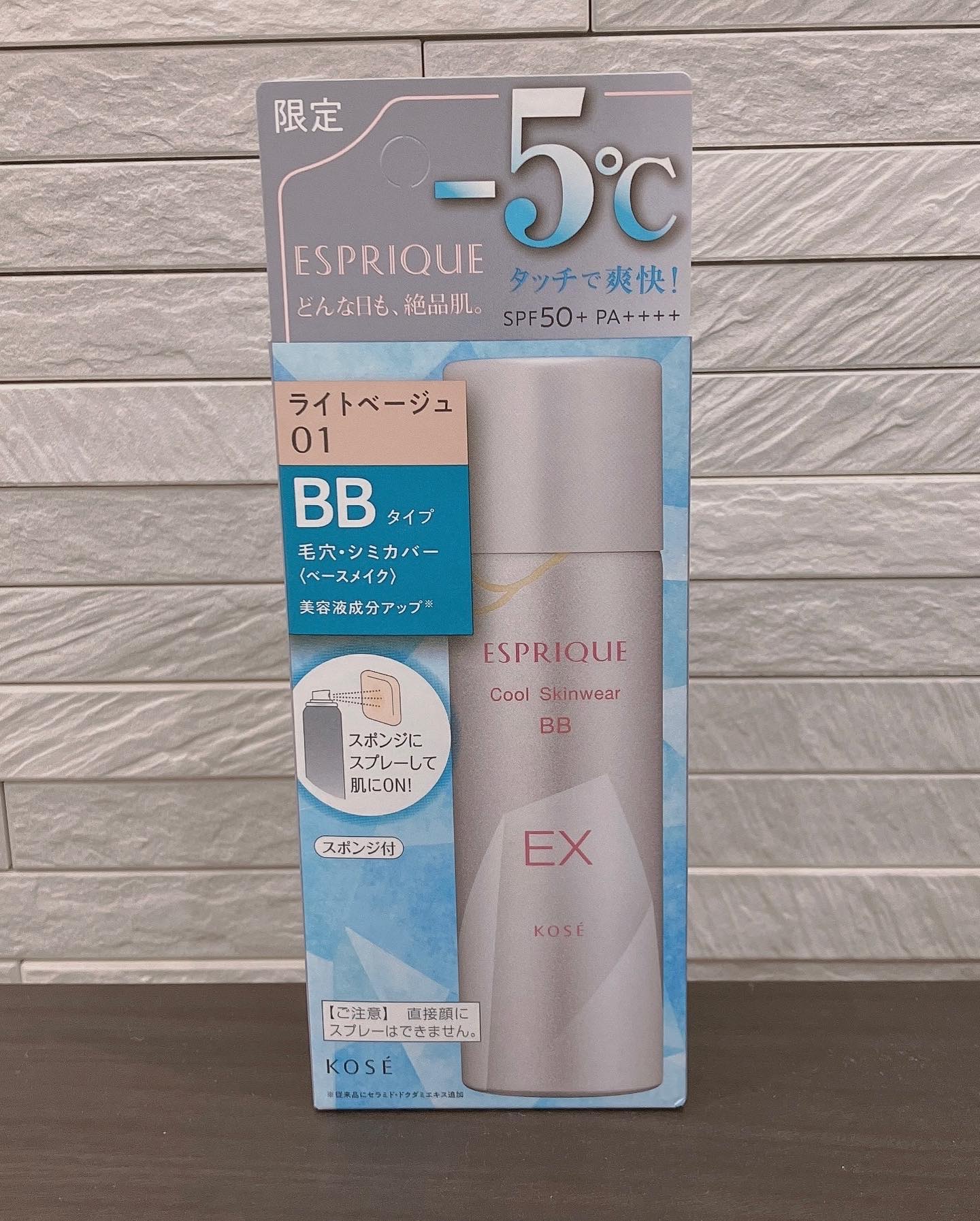 エスプリーククール スキンウェア BB EX 夏肌を守り抜く 「美容液成分」 「機能」 がパワーアップした、 -5℃タッチのBBスプレー。 毛穴の気になる肌もキュッとひきしめ、毛穴・シミをカバー。 毛穴レスで肌悩みのない仕上がりを一日中キープします。 色は、01ライトベージュと02ナチュラルベージュを体験して、私は明るめのファンデーションが好きなのでライトベージュが好みのカラー。 1品5役 (美容液・日やけ止め・化粧下地・ファンデーション・フェイスパウダー) スジやムラができにくく、肌へ均一にしっかりと塗布できる専用スポンジが付いています。 使い方は、スキンケアの後、缶をよく振ってスポンジに1〜2秒吹きかけます。 肌感温度-5℃タッチなので、スポンジで顔にポンポンすると、ひんやりとしてこれがものすごく気持ち良いの! カバー力はそれほど高くはないんだけど、ツヤ感のある素肌っぽいお肌に仕上がるのが良い感じ✨ このひんやり具合がやみつきになる♡ これからますます暑くなってくる時期にも快適にメイクできそう!