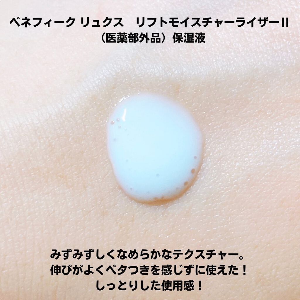 BENEFIQUEのベネフィークリュクスリフトモイスチャーライザーⅡを使用しました😊化粧水と乳液の機能を1本化した美容液になっております✨肌ダメージが重なりやすい大人のゆるみに着目して、保湿成分が独自の美容法とともに角層の深くまで浸透してくれるそうです。乳液のような少しとろみのあるテクスチャーになっております。みずみずしく、なめらかに肌に伸びてくれます。ベタつきもないのに肌がしっとりとしてくれる感じがあり、使用感が良かったです。化粧水と乳液が1本になっているので、忙しいときはこちらのケアだけでもよさそうです。肌にうるおいを与えながら、シミやそばかすを防いでくれるのは嬉しいです。