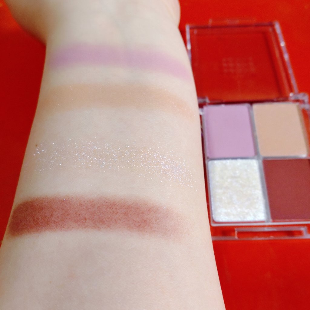 粉質めーーーっちゃ良いですね!! これで550円は破格だわ…… マットなカラーはしっとりしてて密着感高め🙆 このパレットは挑戦しやすい! 単色だと若干浮いちゃうけど、 右上のラメと合わせると、 いい感じに黄みが入って馴染みが良くなる❤️ 全体的に発色がいいから、組み合わせ次第で いろいろ遊べそう。これは本当に良いパレット。 左下の青メインの偏光ラメもめちゃめちゃ可愛い〜。 右下は濃いめの赤に見えるけど黄み肌に乗せると 赤みブラウン系の発色で、秋冬は単色でもイケそう。 03に関しては、別メーカーのパレットとは そうそう被らない配色も込みで魅力を感じた。