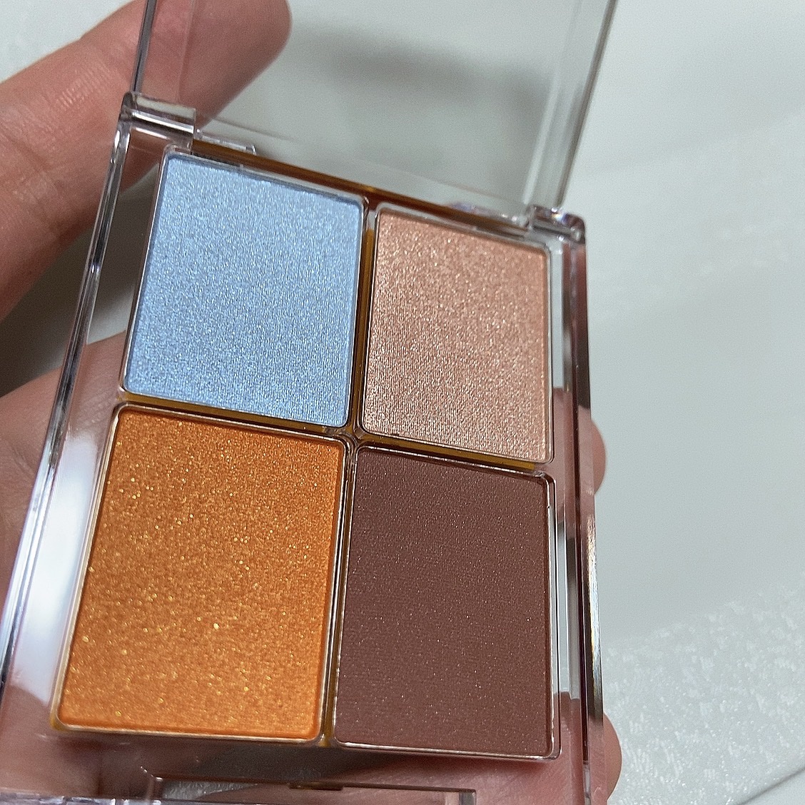 使ってみて、思ったより良かったのが左上の水色のラメ🤍 透明感がすごく出るので目の上にのせたり、目尻にのせたりしてます。どんな色と組み合わせても合う気がします。 右上のベージュも綺麗なラメで、これは茶系や暖色系のシャドウの時に使っています。こちらもハイライトに使えました💓 左下のオレンジは見た目が可愛い!と思って1番使いたかった色でしたが、私の目には合いませんでした。私のまぶたがプクッとしているタイプなので、腫れぼったく見えてしまいました。 右下のブラウンは目のキワにぬっていますが、万能カラーだと思いました。 4色入ってて、ラメも綺麗で550円なのでコスパがとても良いです。粉飛びは少しありました。パッと見、奇抜ですが、肌にのせるとかなり馴染むし、ぼかしたりもしやすかったです✨️