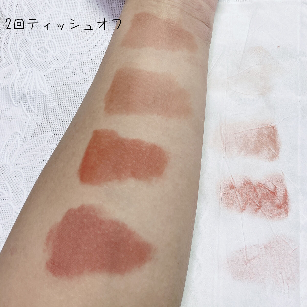 テクスチャーはコッテリと重たく、名前の通りベルベットのようなマットな仕上がりです エアリーマットリップ同様、ティッシュオフしても蛍光色に発色することなく使いやすいリップ マットリップ特有のめっちゃ乾燥するということも無く、くちびるも荒れにくいのでとっても良いです! 食べたり飲んだりすると色が落ちますが、汚く崩れないのとほんのり色が残ってくれます 色も仕上がりもとっても可愛いベルベットクリーミィリップ!