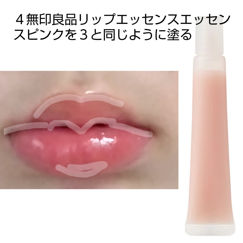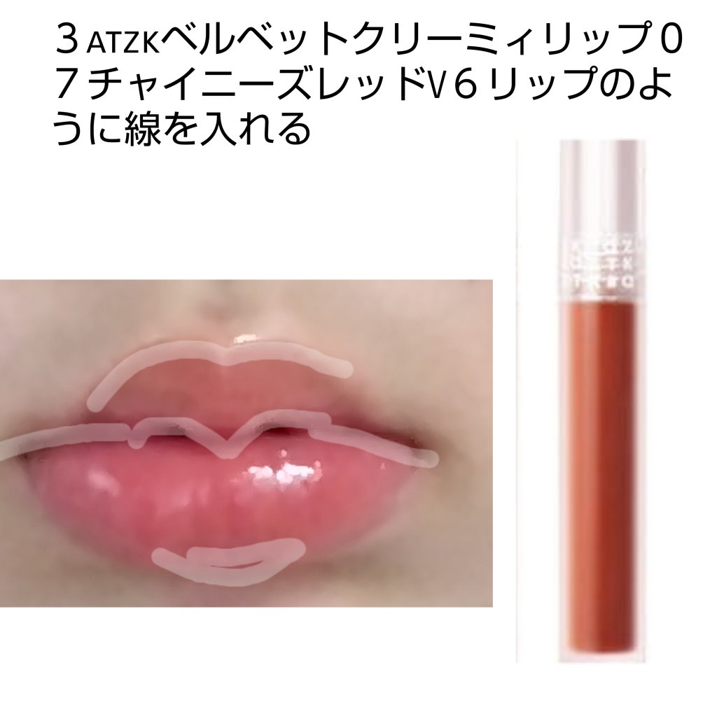 1DHC薬用リップクリームセンシティブを全体に塗る 2rom&ndデュイフルウォーターティント01インコーラル全体に塗る 3aZTKベルベットクリーミィリップ07チャイニーズレッドをV6リップに線を入れて内側にぼかす 4無印良品リップエッセンスエッセンス・ピンクを3番と同じように塗る